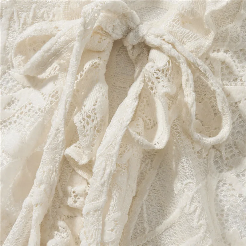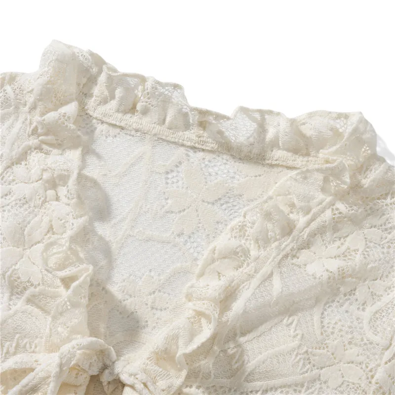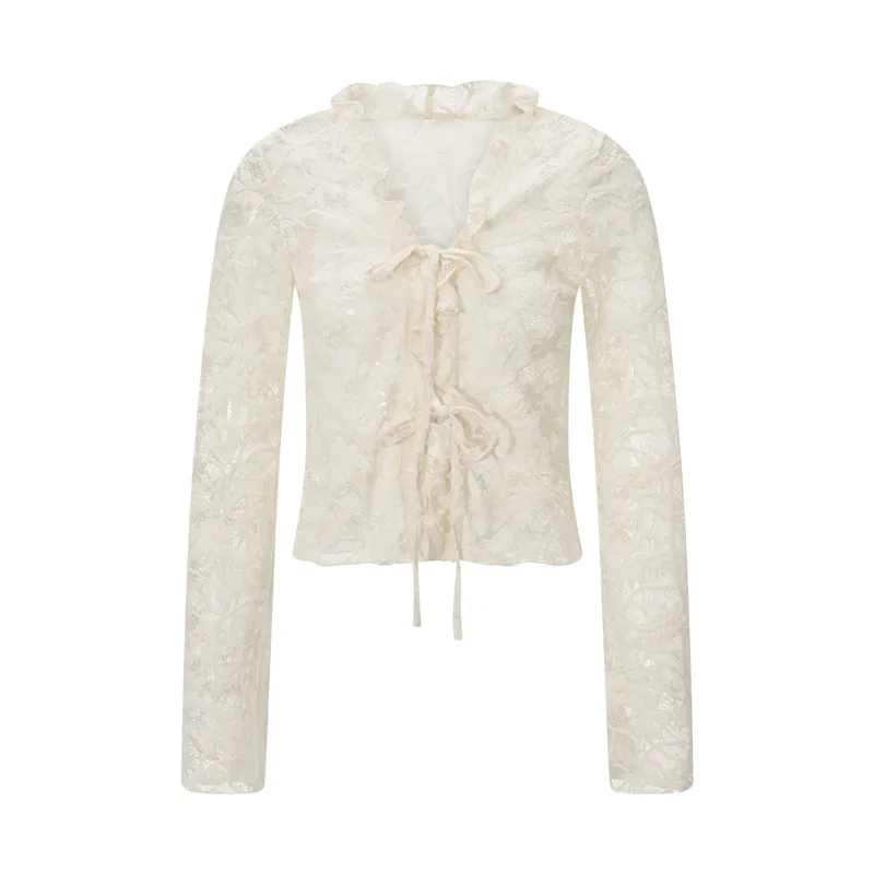 BXOXO Women's Summer Lace Floral Tops Sexy Y2k See Through Flare Long Sleeve Tie Front Sheer Slim Crop Cardigan Clubwear
