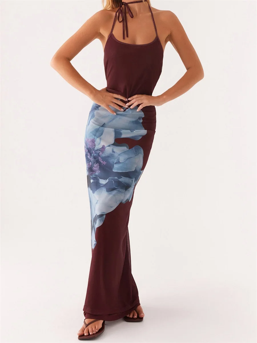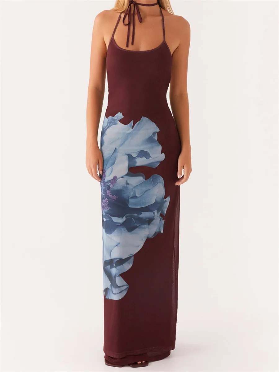 BXOXO Women's Summer Long Cami Dress Fashion Sleeveless Open Back Halter Neck Flower Print Dress Beach Vacation Sundress