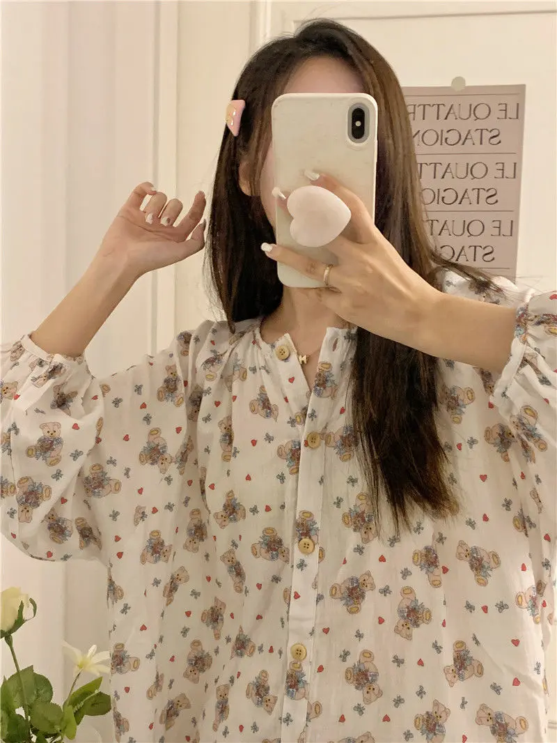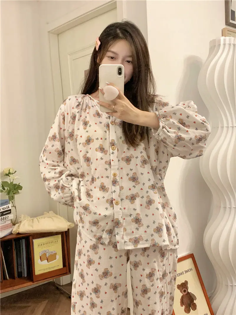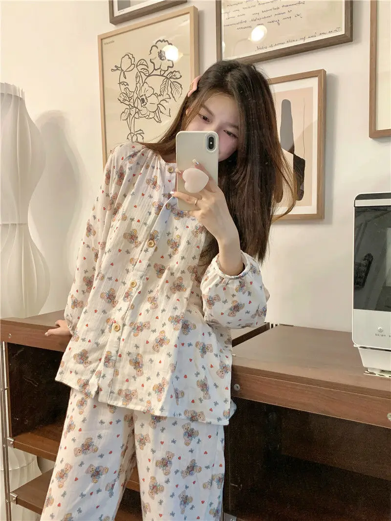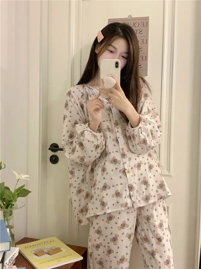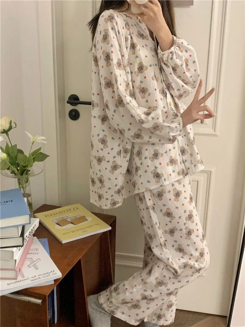 Bxoxo Women's Sweet Cute Pajamas Set Female Korean Style Home Clothing Girl Bear Foral Print Sleepwear Long Sleeve Pant Nightwear 2XL