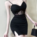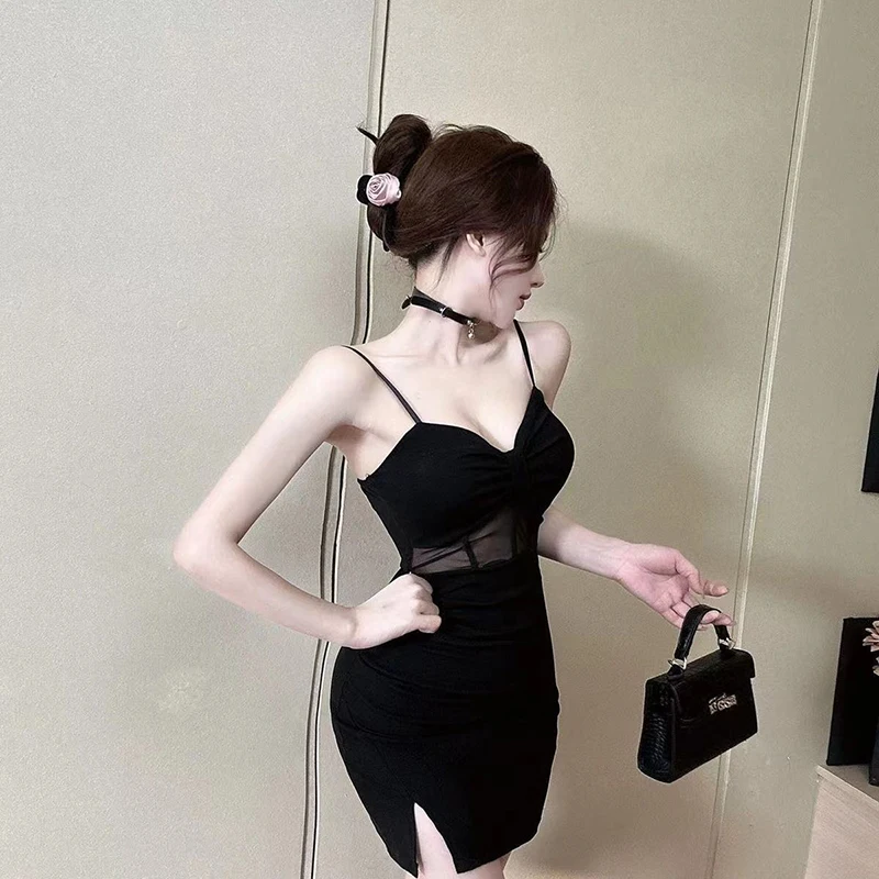 Bxoxo Y2K Black Hollow Out Slim Dress Women Summer Sexy Low Cut Camis Vestidos Female Fashion Mesh Patchwork Skinny Mini Dress