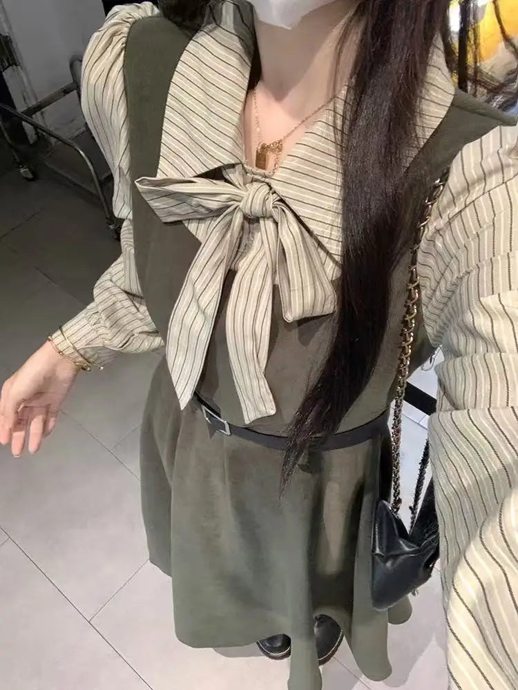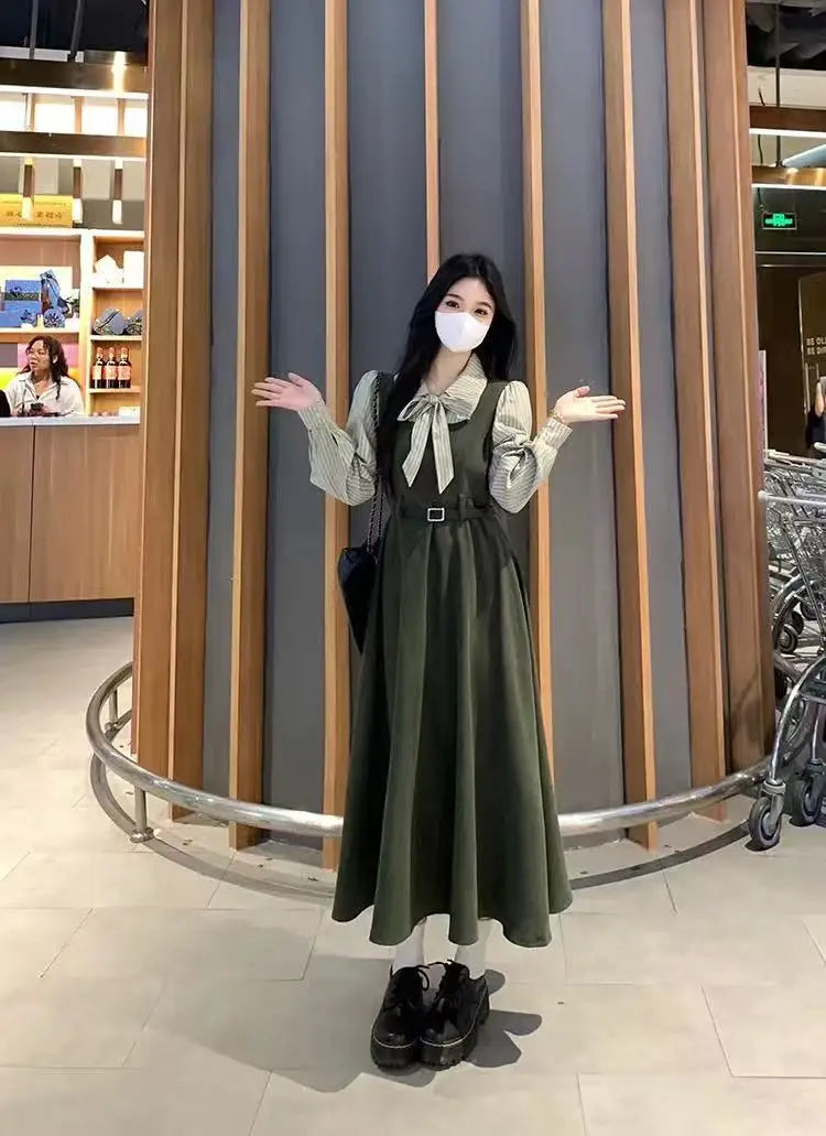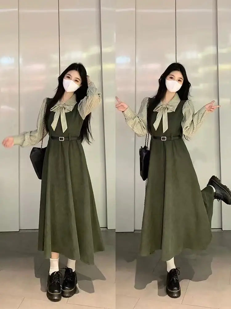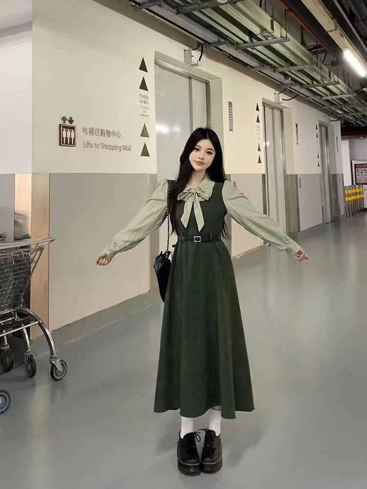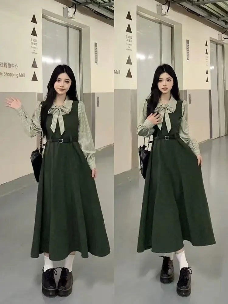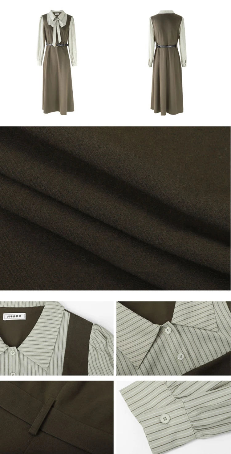 Bxoxo Y2K Fake 2 Piece Long Sleeve Midi Dress Women Autumn Chic Preppy Bow Tie Lapel Shirt Elegant Office Lady Casual Fake Two Pieces