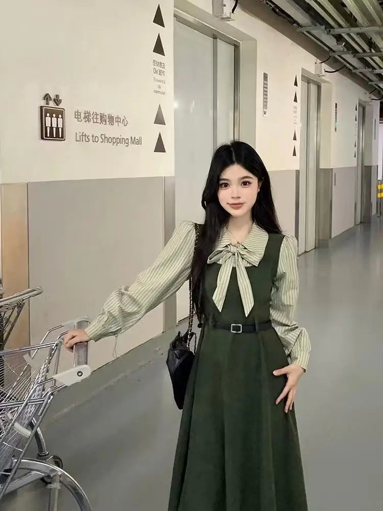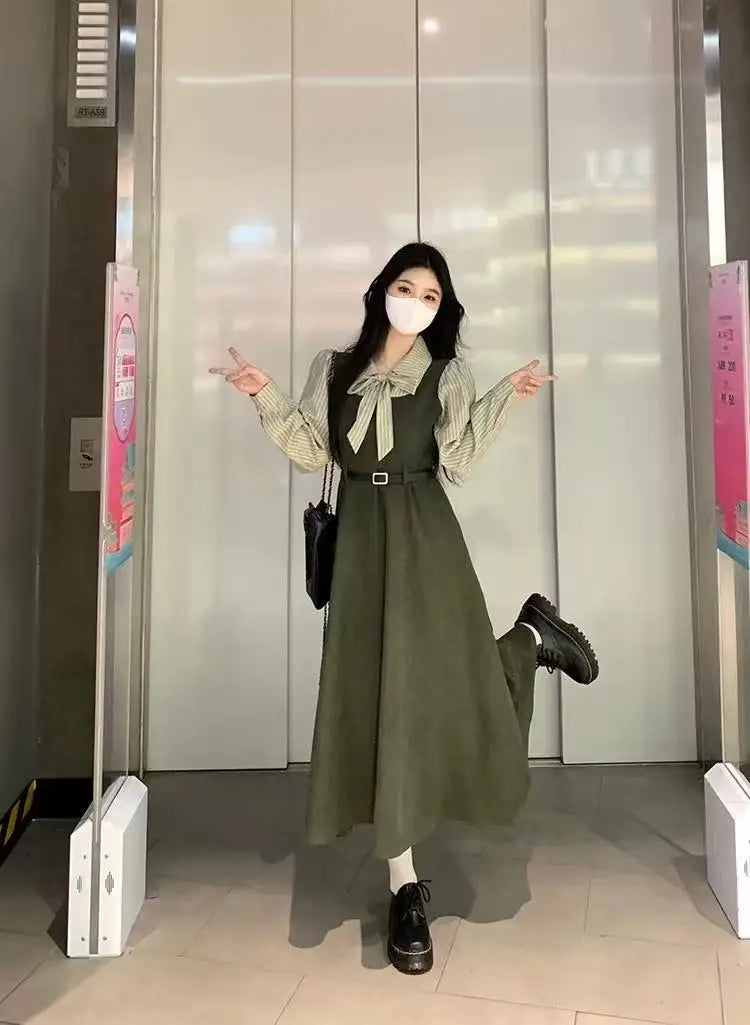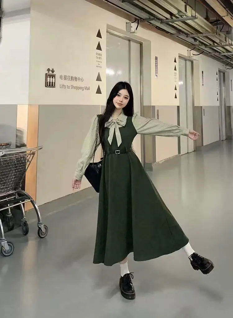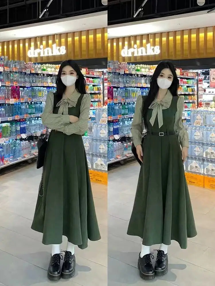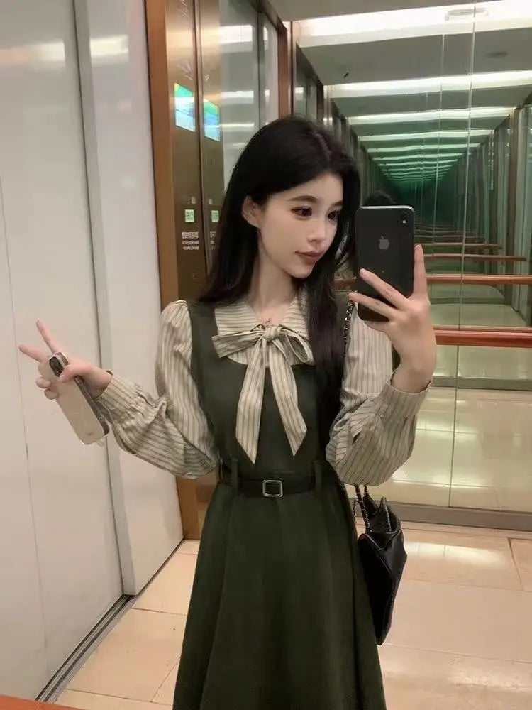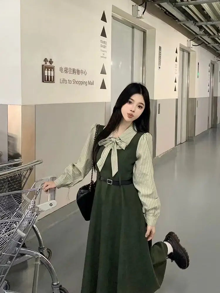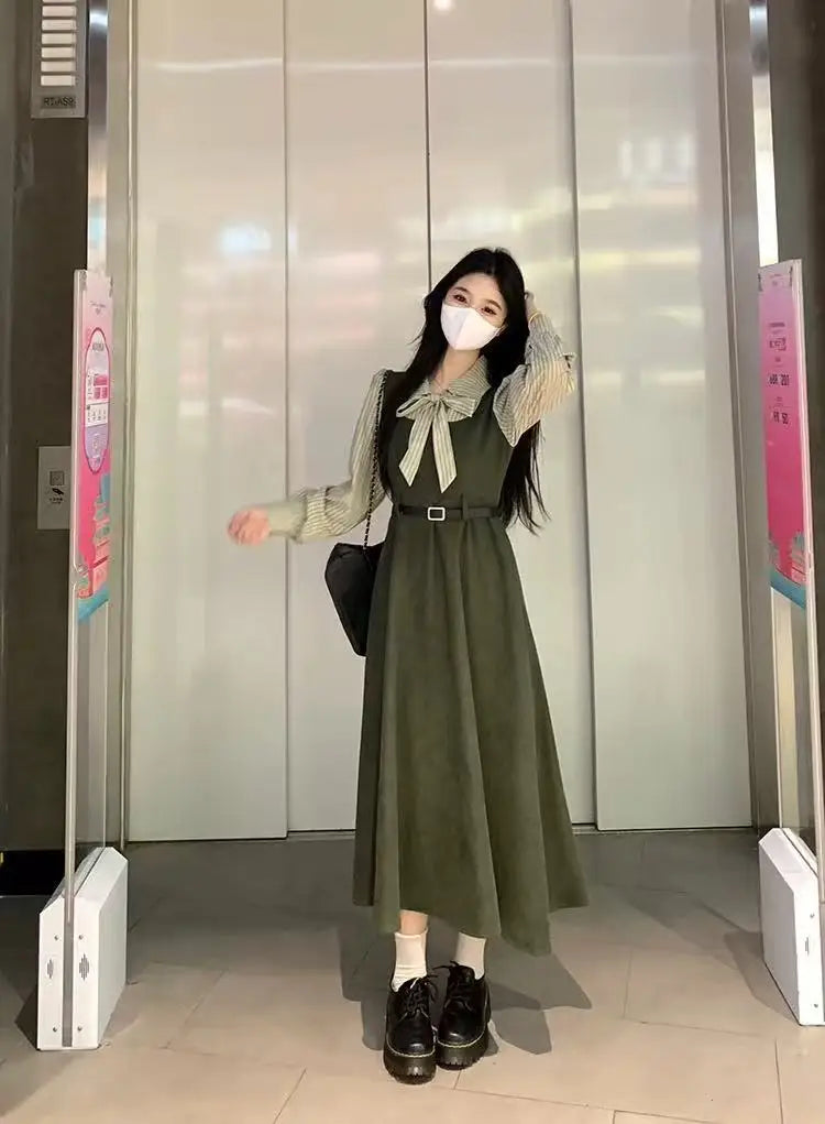 Bxoxo Y2K Fake 2 Piece Long Sleeve Midi Dress Women Autumn Chic Preppy Bow Tie Lapel Shirt Elegant Office Lady Casual Fake Two Pieces