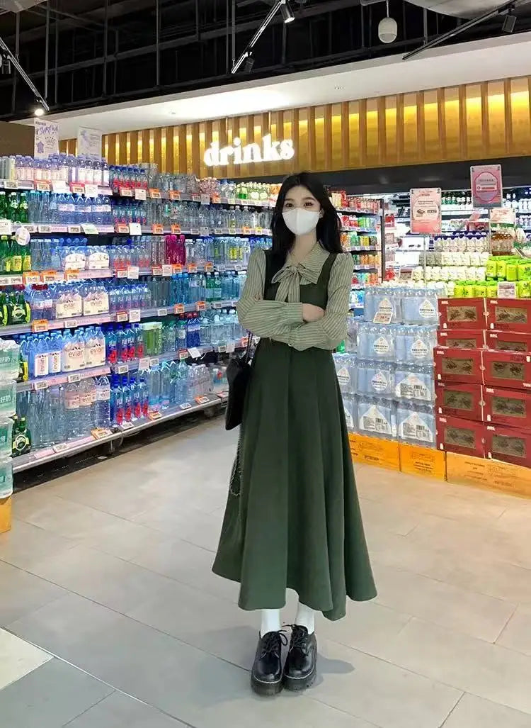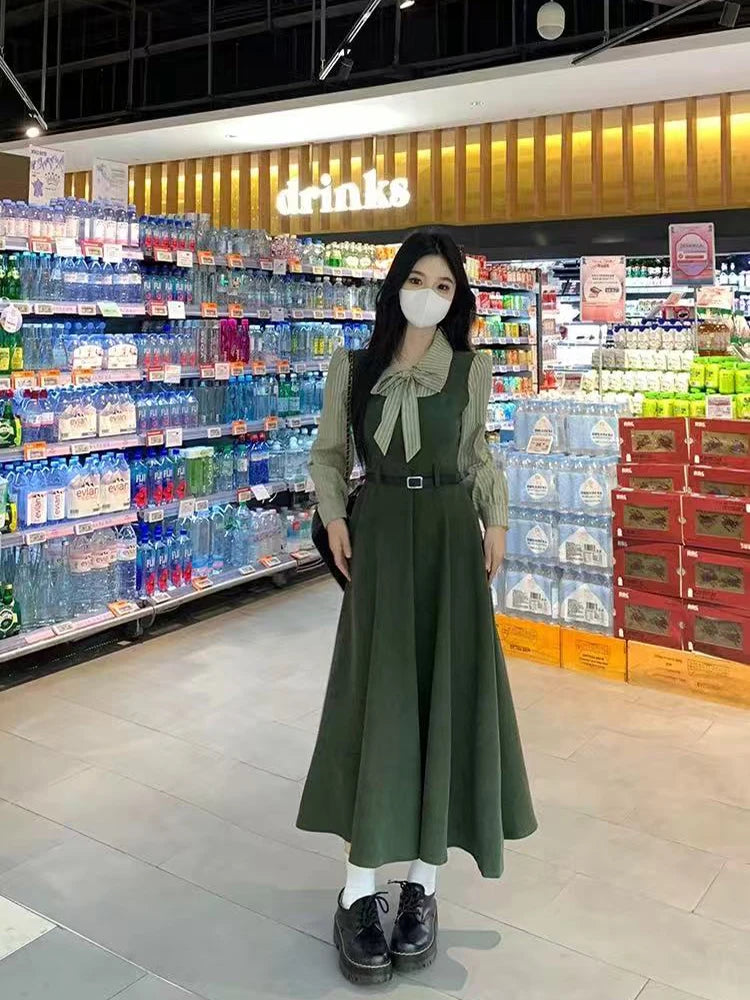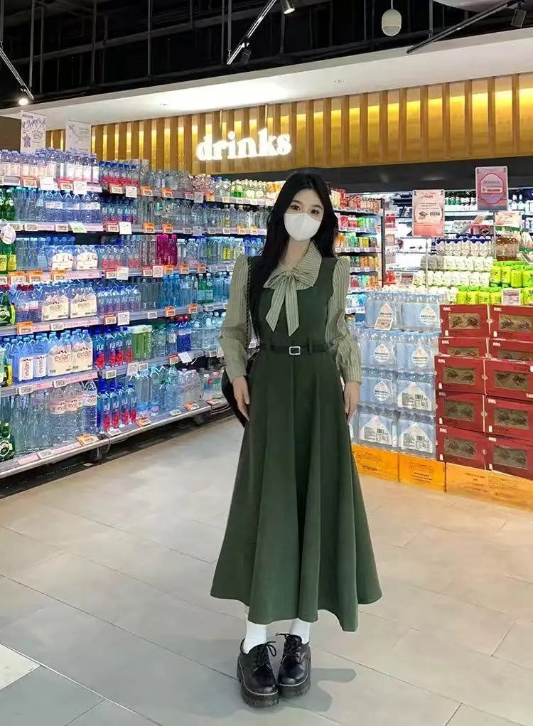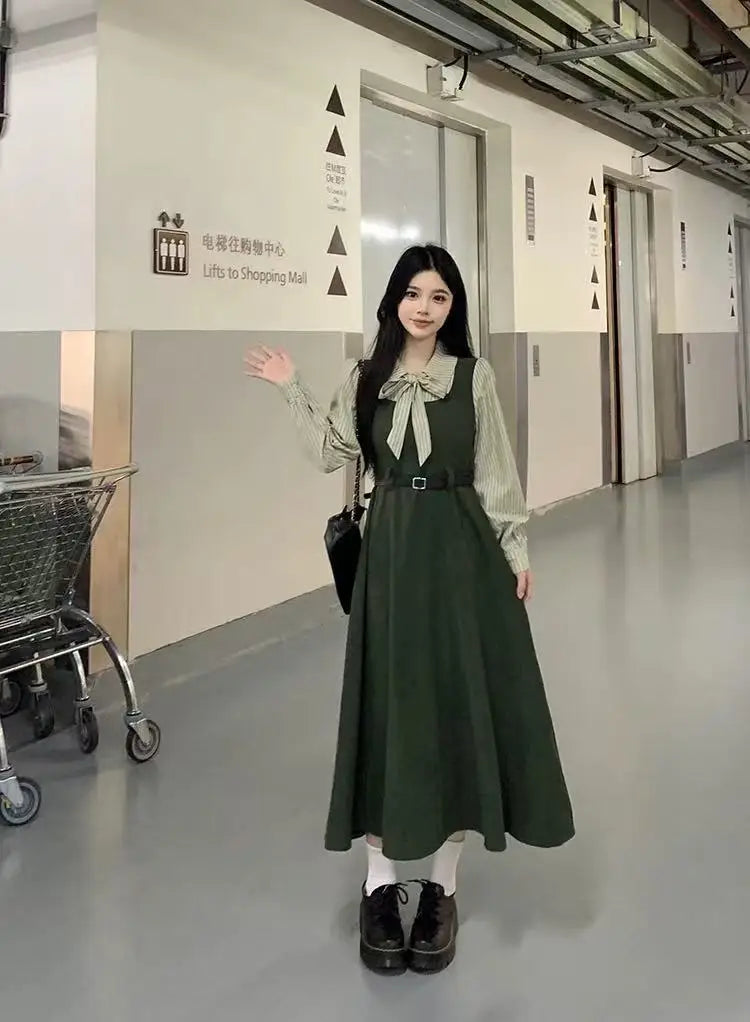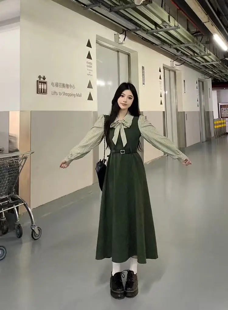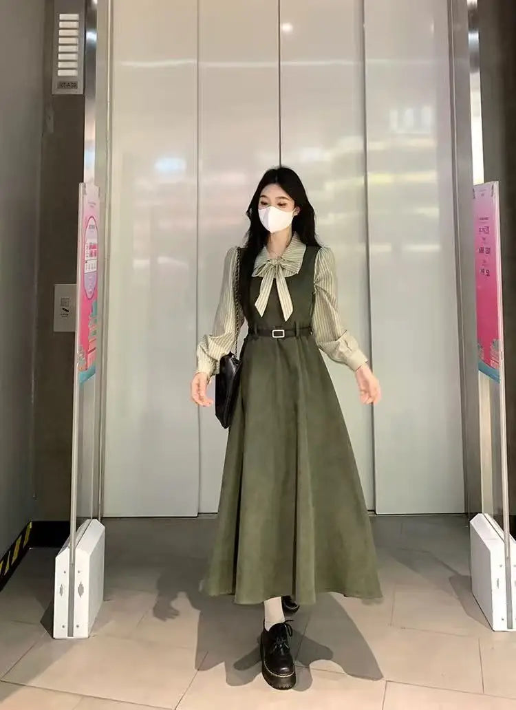 Bxoxo Y2K Fake 2 Piece Long Sleeve Midi Dress Women Autumn Chic Preppy Bow Tie Lapel Shirt Elegant Office Lady Casual Fake Two Pieces