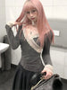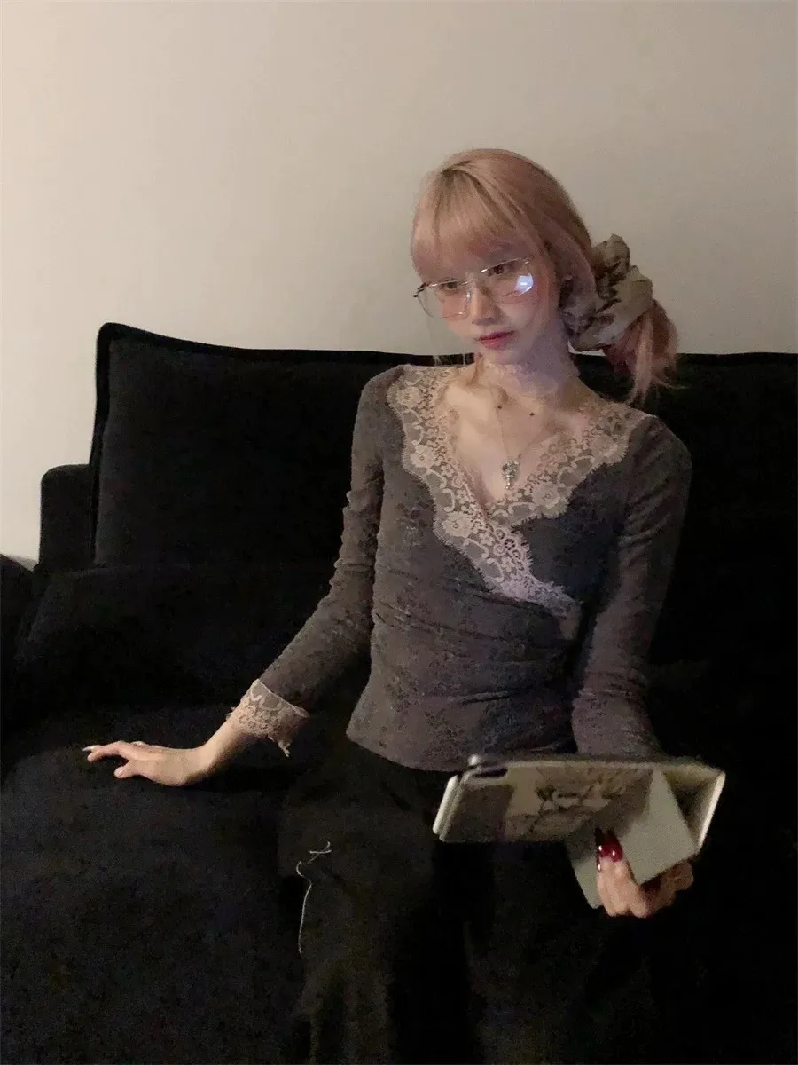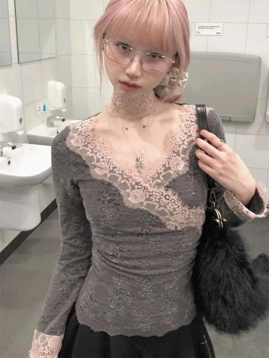 BXOXO Y2k Japanese T Shirt Women V Neck Patchwork Lace Tee Tops Streetwear Vintage Tops Korean Style Skinny Tshirts Autumn