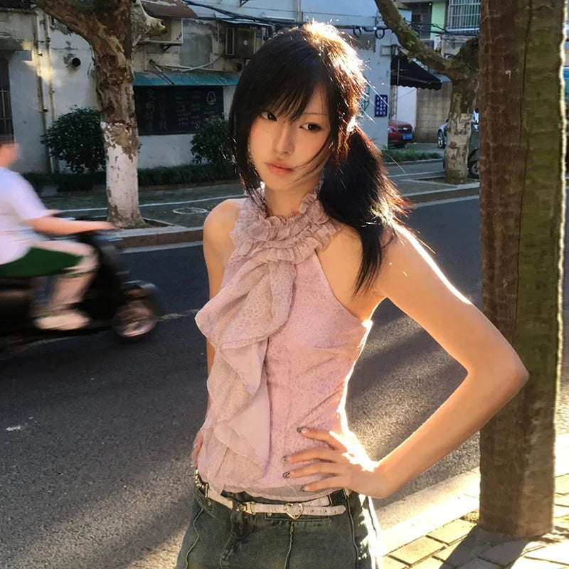 BXOXO Y2k Japanese Tank Tops Women Leopard Sleeveless T-shirt Streetwear Fairycore 2000s Aesthetic Lace Camis Ruffles Summer