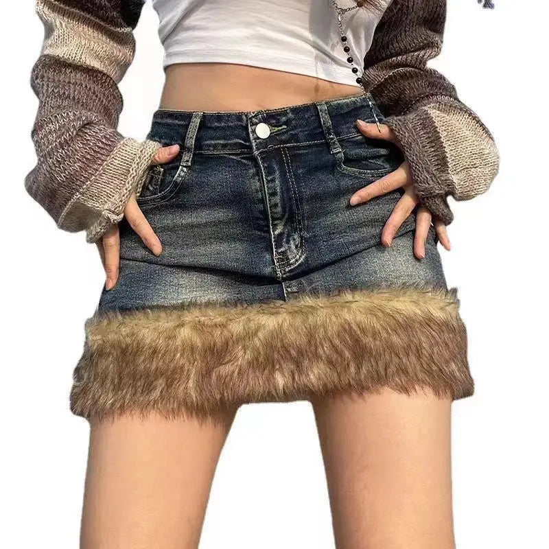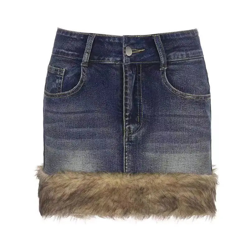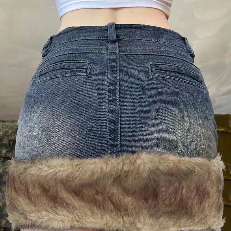 Bxoxo Y2k Vintage Denim Skirt Women Sexy Harajuku Fur Patchwork Mini Skirts Retro Slim Up Streetwear A-line Short Skirts