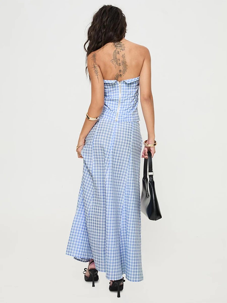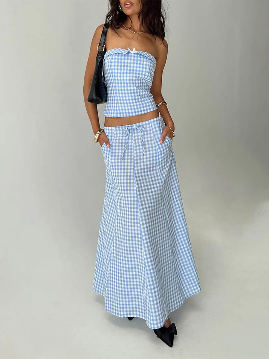BXOXO Y2k Women's 2 Piece Outfits Summer Plaid Maxi Skirt Set Crop Tube Crop Tops and Flowy Hem Long Skirt Sets Aesthetic