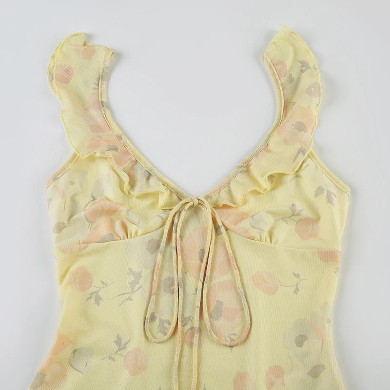 BXOXO Yellow Summer Print Camisole Dresses Slim Fit Elegant Fairycore Fashion Trendy Causal Holiday Style Clothes