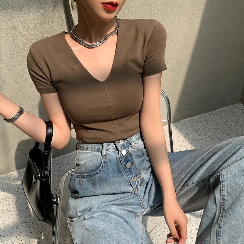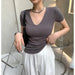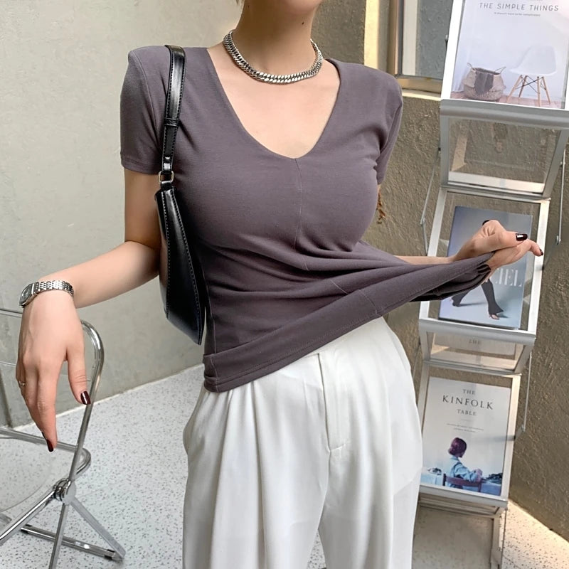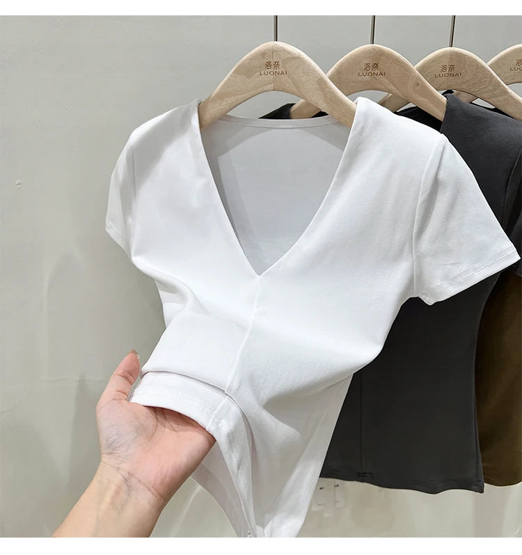 Casual Cotton V Neck Short Sleeve T-shirt Women Fashion Shoulder Pad Solid Color Summer Slim Tees Ladies Basic Elastic Tops