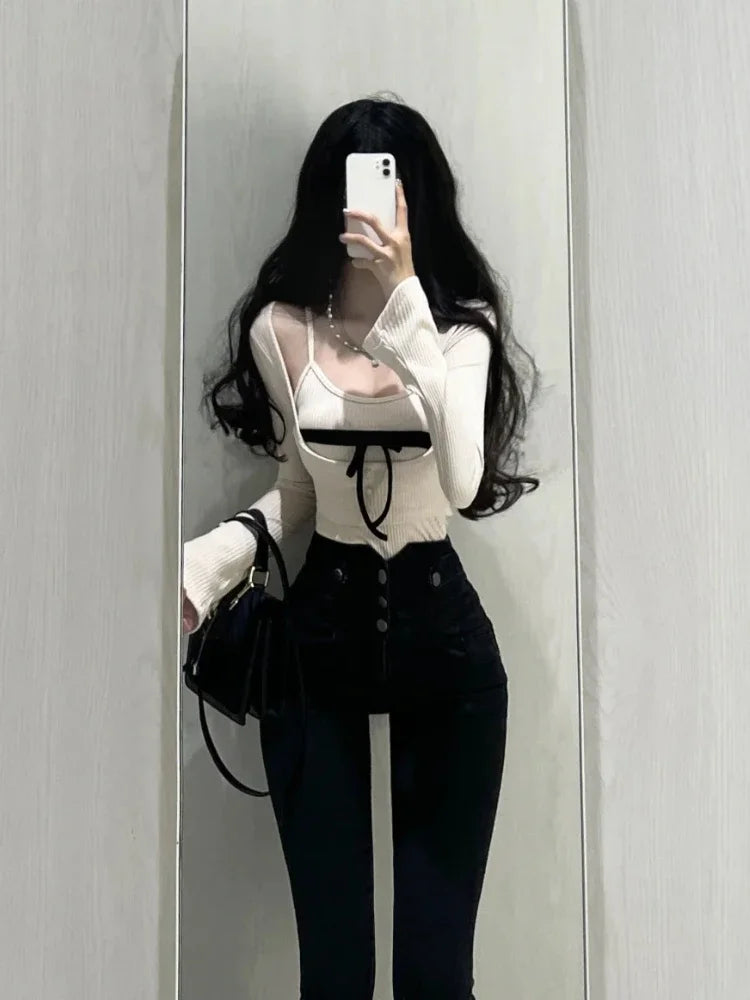 Casual Y2k Crop Tops Women 2 Piece Sets Outwear Korean Fashion Clothing Bodycon Slim Tshirts Sexy Blouse Female Spring