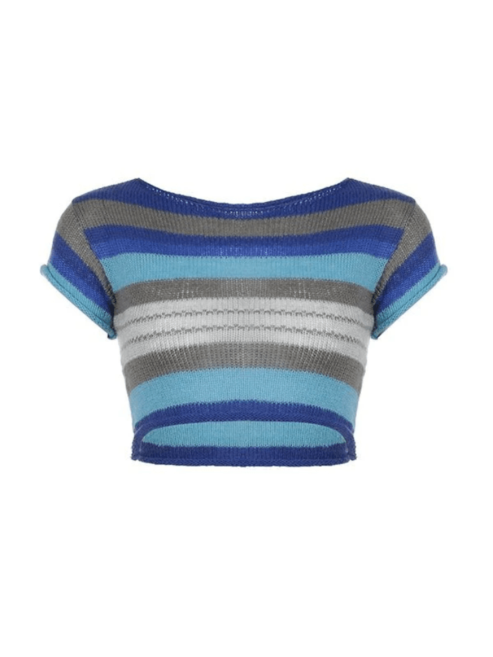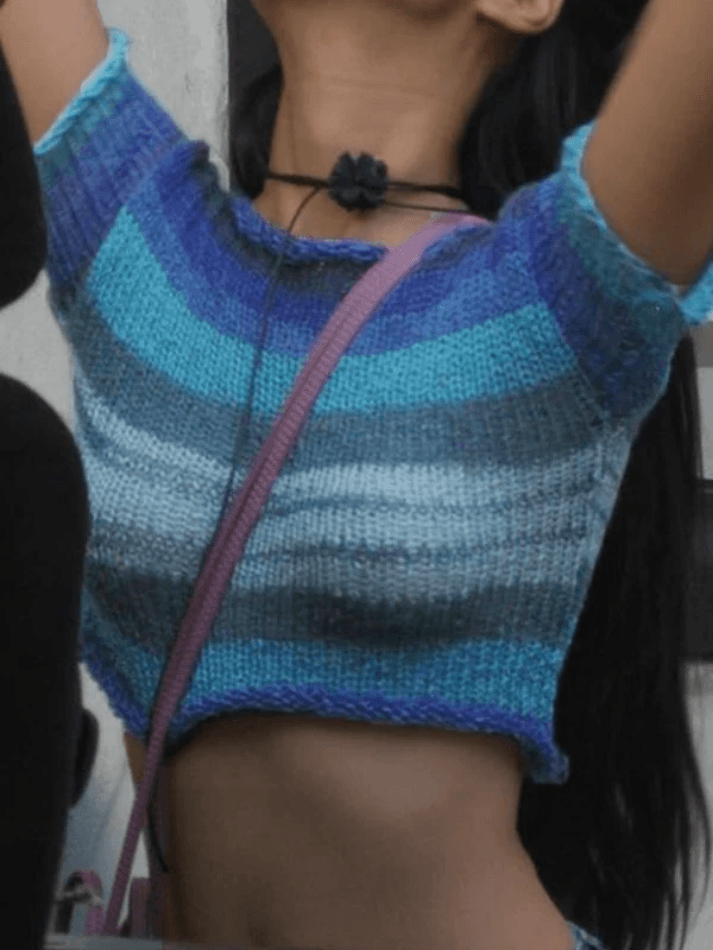 Description: Embrace the summer vibes with our Striped Knit Crop Top. Made from lightweight and breathable loose knit fabric. this top is perfect for keeping cool in the heat. With its super cropped length and eye-catching contrast color block striped panels. it adds a trendy and youthful touch to any outfit. Ideal for casual outings or vacation adventures.