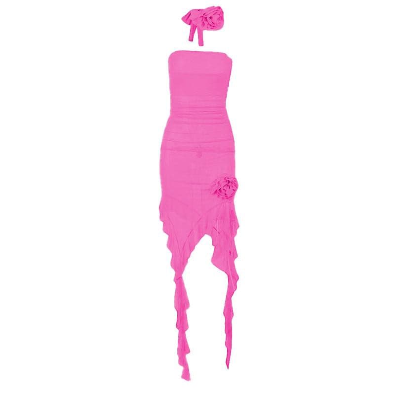 • Solid Slit Sheer Mesh See Through Flower Applique Mini Dress
