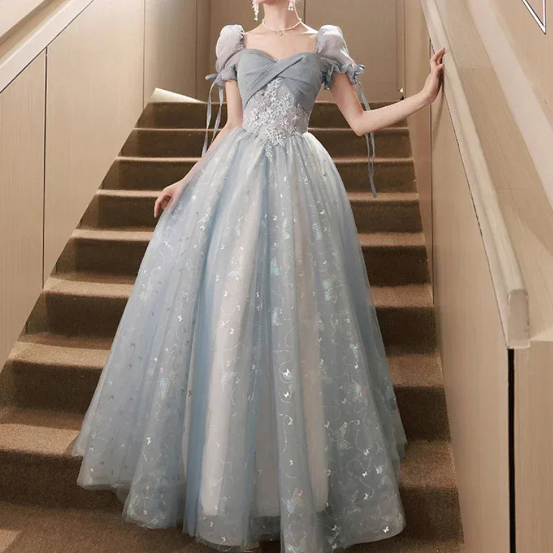 Customized Simple Solid Square Collar Puff Sleeve Princess Prom Dress Front Cross Bow Design Slim A-line Vestidos High End Strap