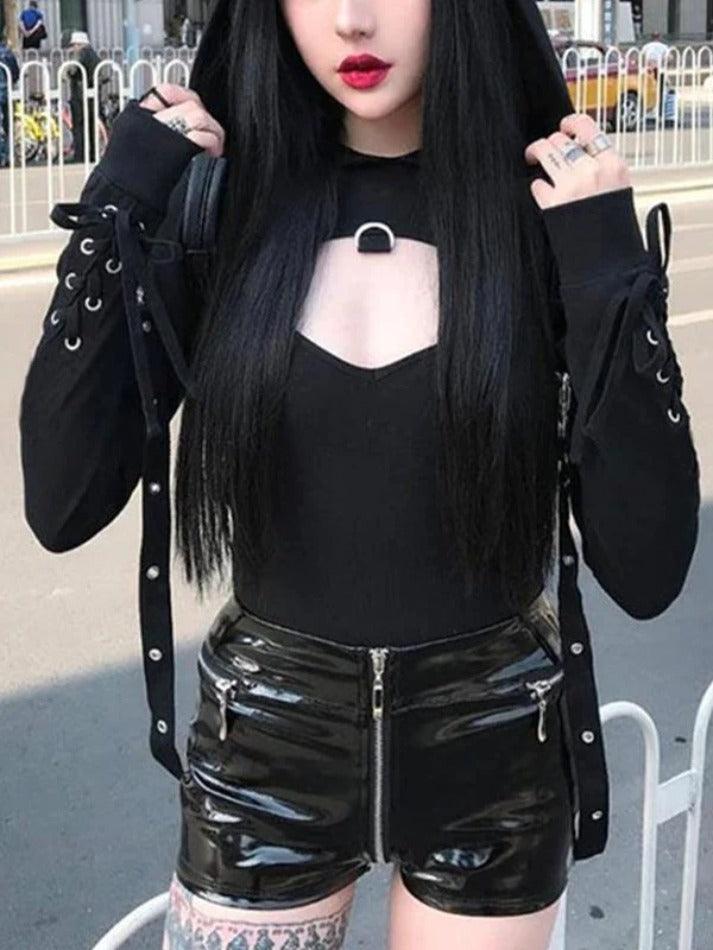 Description: Elevate your style with this unique bolero-style hoodie featuring detachable eyelet straps and adjustable criss-cross ties at the back and sleeves. Perfect for a trendy, edgy look.