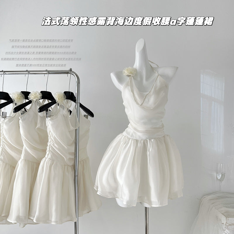 BXOXO - summer inspo French Solid Colour Swinging Collar Slim Dress Women Summer New Sexy Backless Seaside Vacation A-line Fluffy Skirt