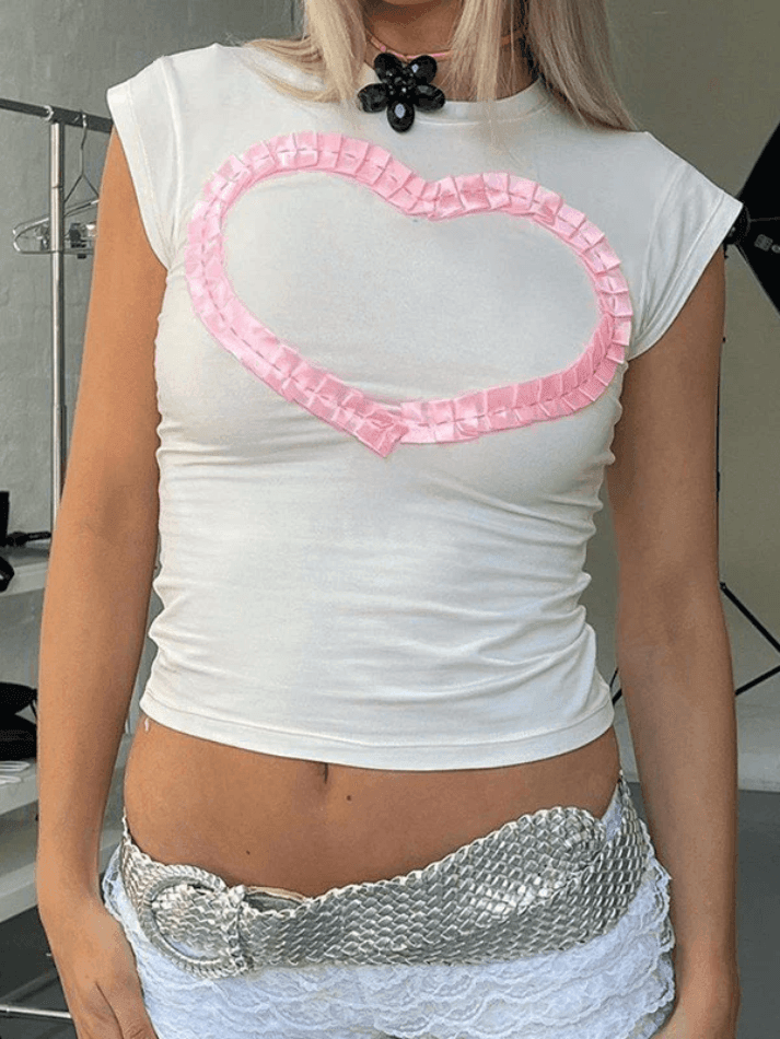 - Add a touch of cuteness with our Frill Heart Patch Crop Top.
