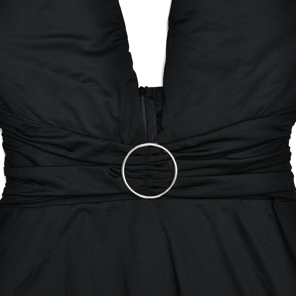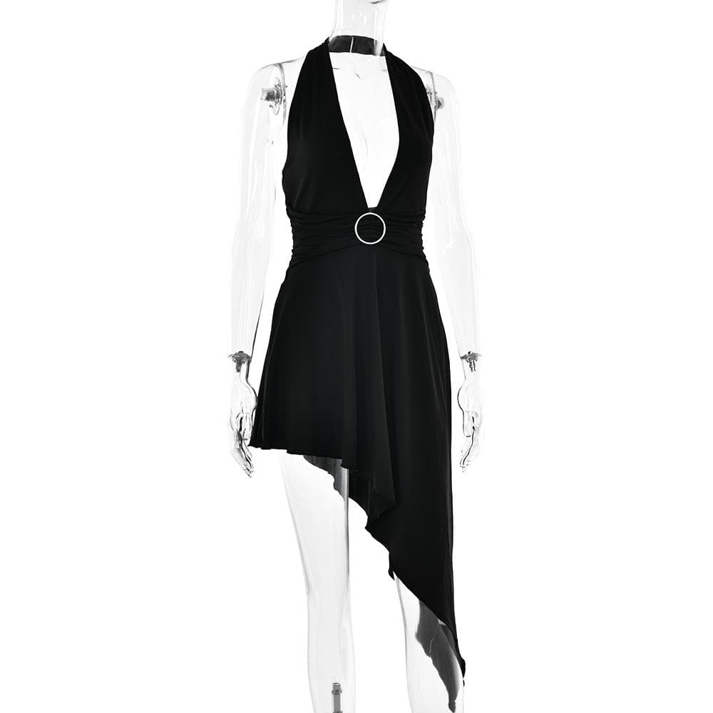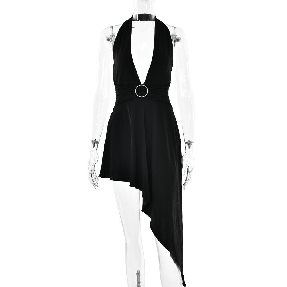 • Halter O Ring V Neck Irregular Backless Solid Midi Dress