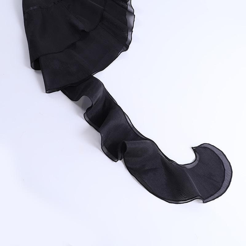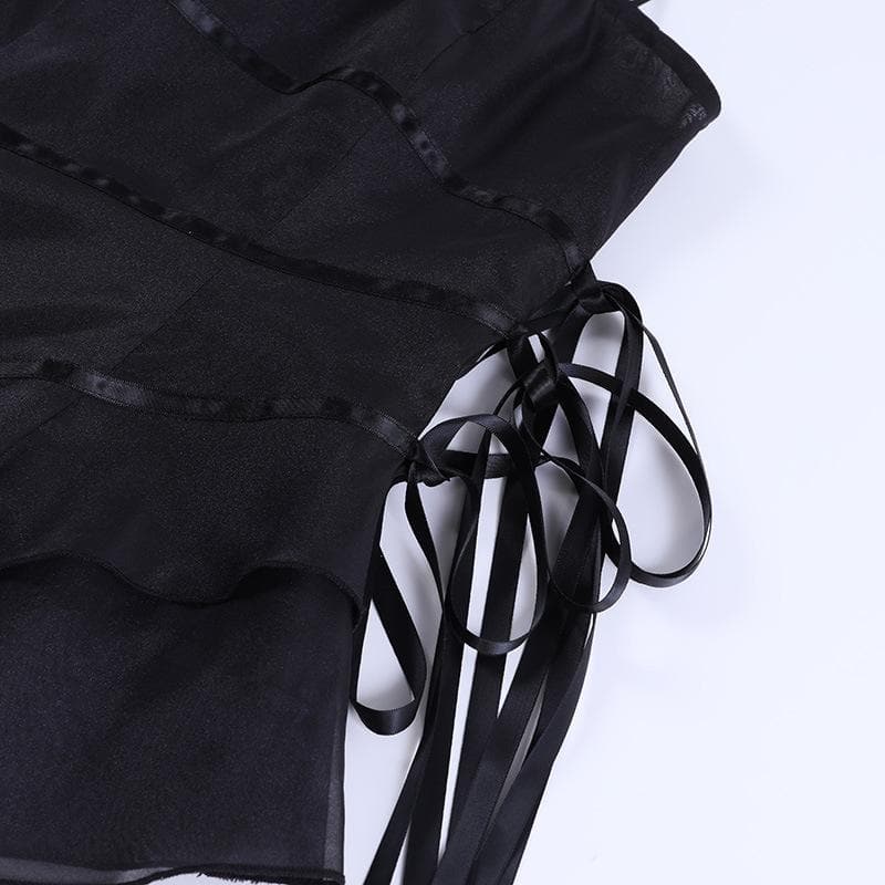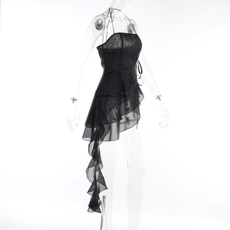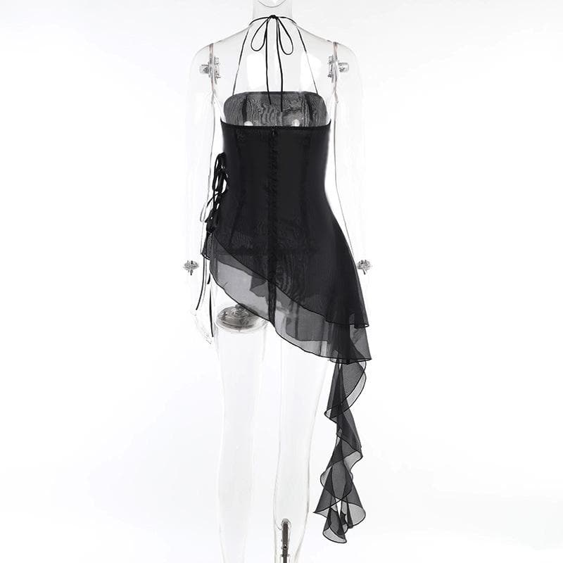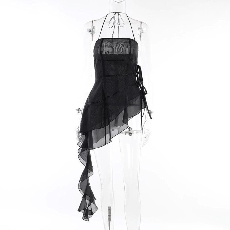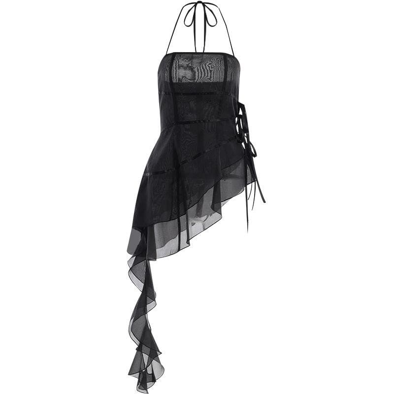 • Halter Ruffle Irregular Ribbon Sheer Mesh Mini Dress