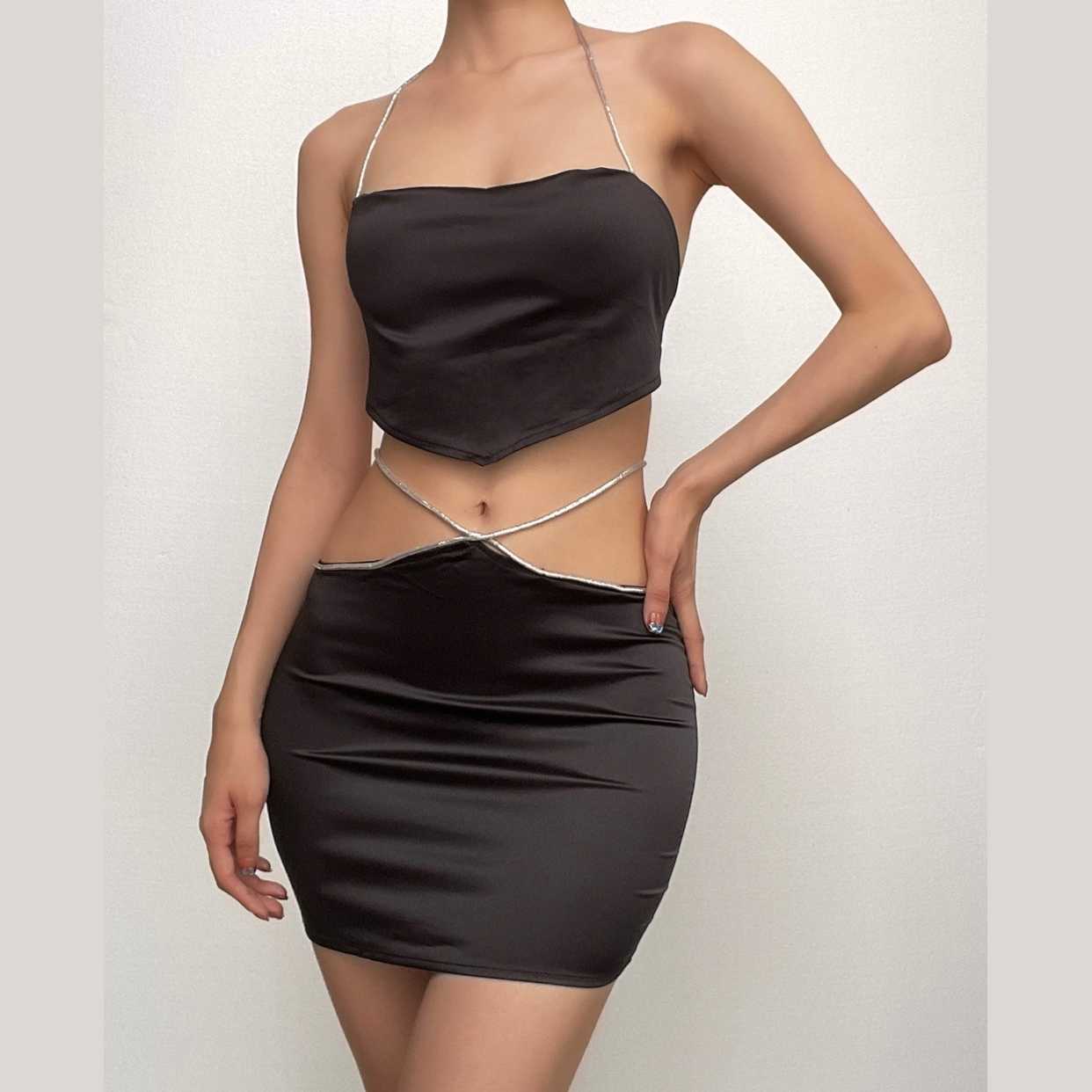 • Halter Self Tie Backless Zip-Up Solid Cowl Neck Mini Skirt Set
