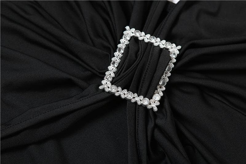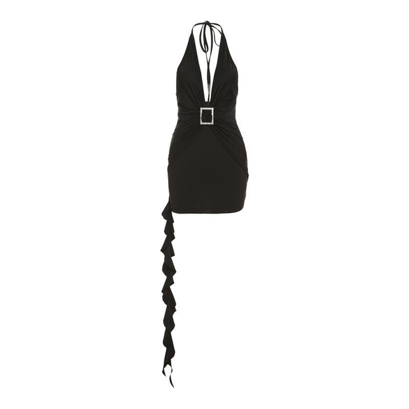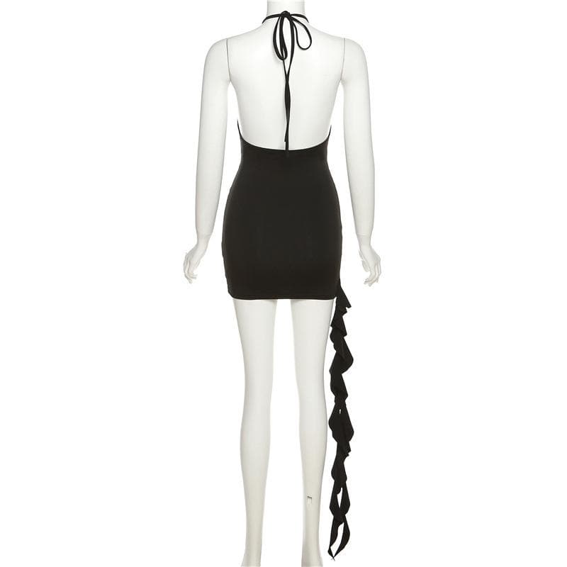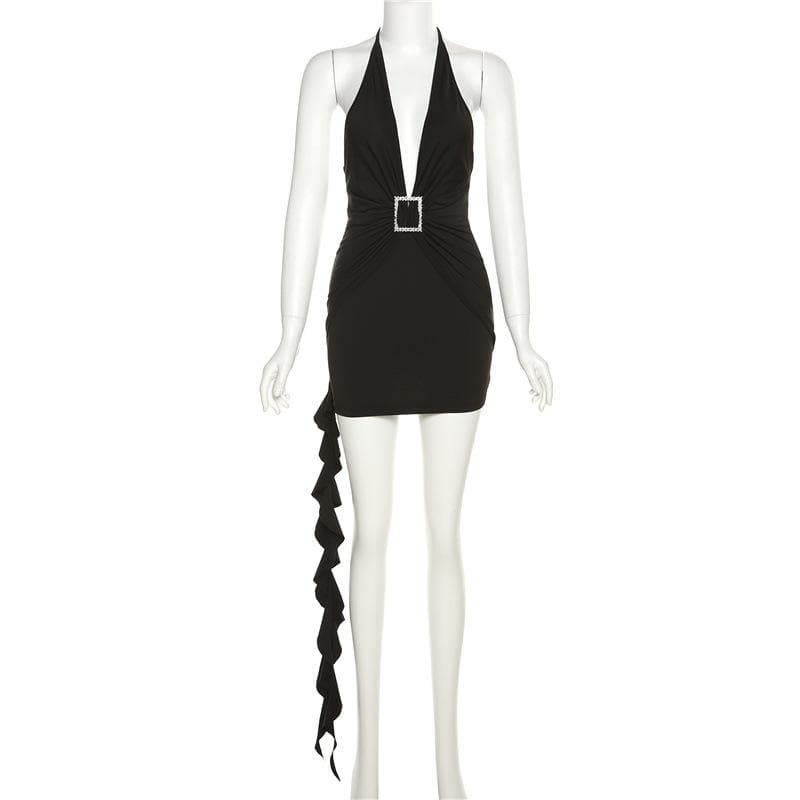 • Halter Solid V Neck Self Tie Buckle Backless Mini Dress