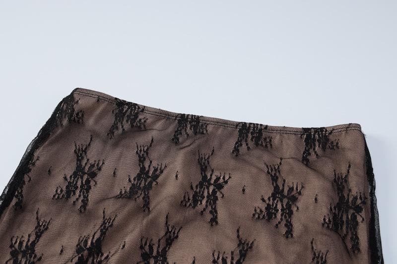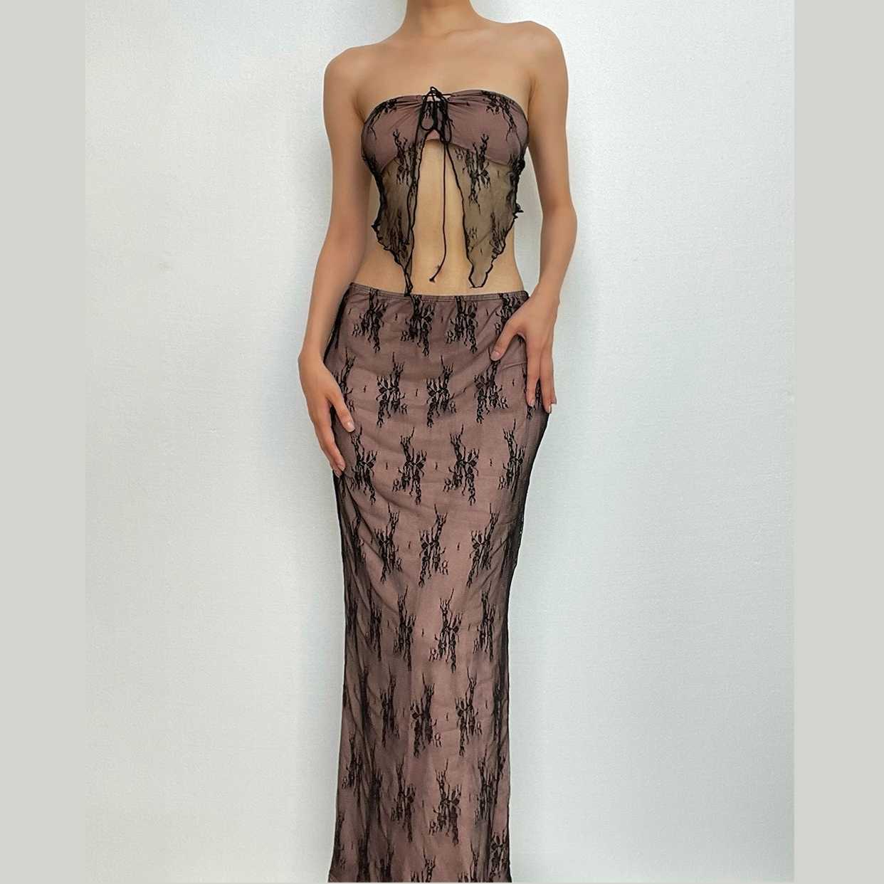 • Lace Contrast Self Tie Backless Tube Maxi Skirt Set