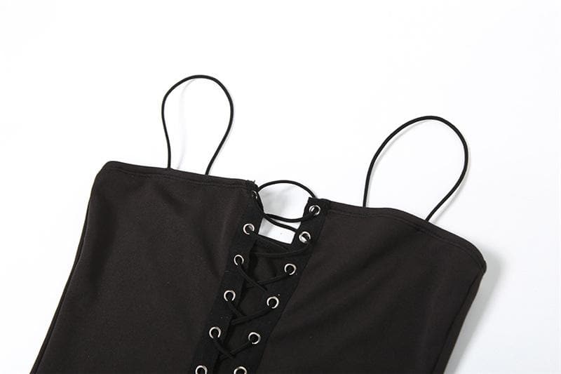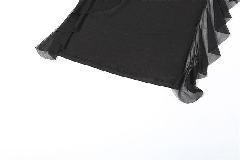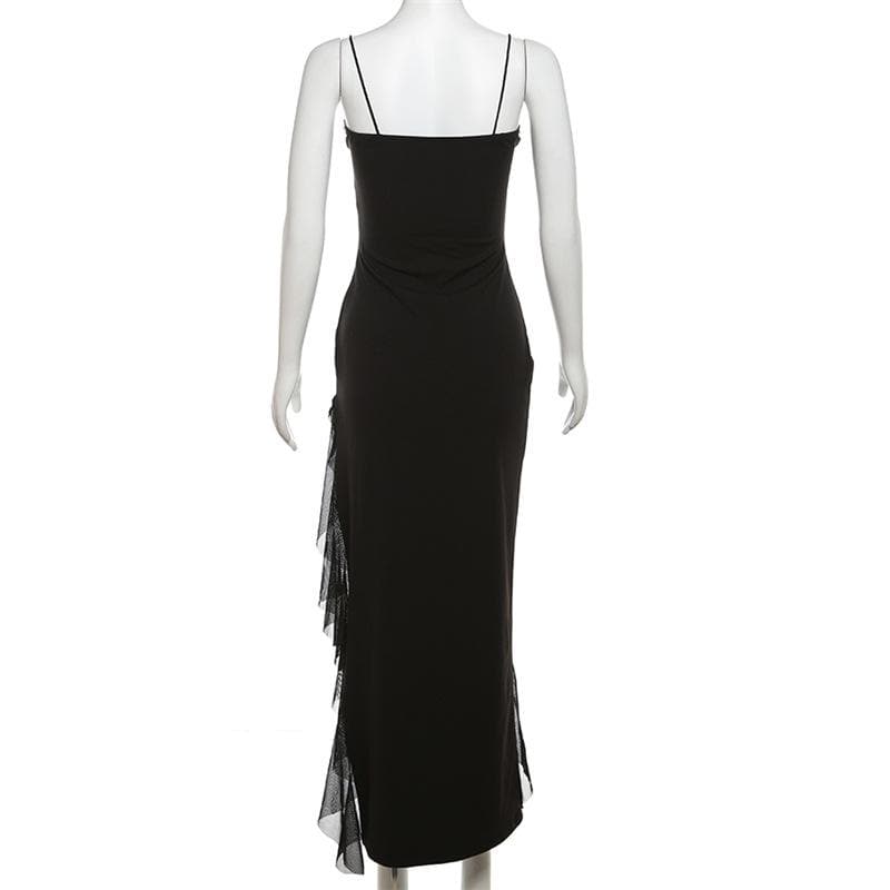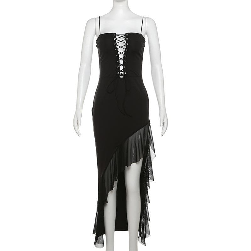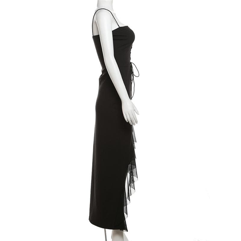 • Lace Up Ruffle Irregular Backless Mesh Cami Maxi Dress