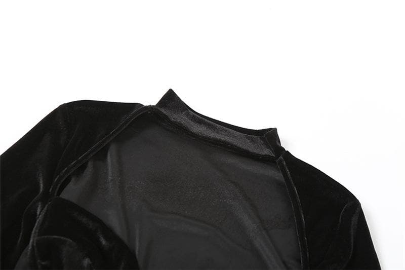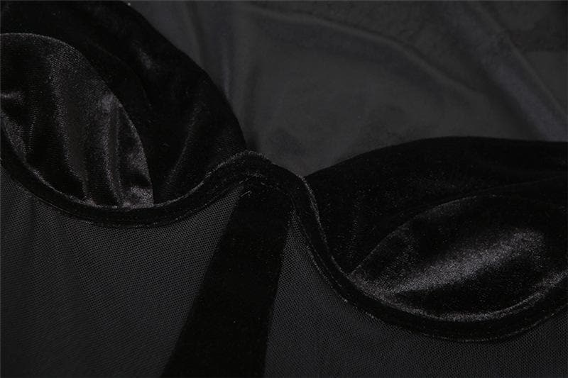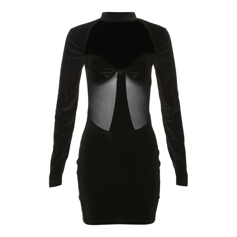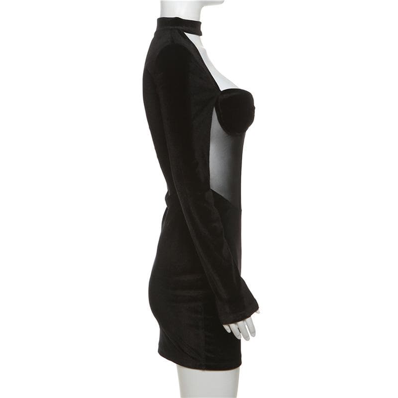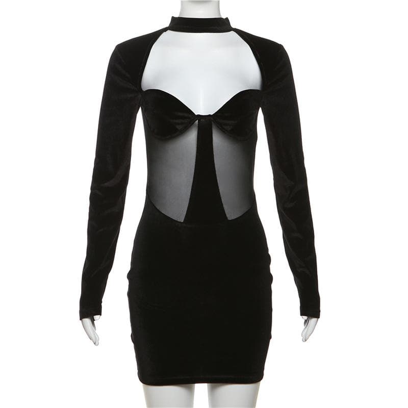 • Long Sleeve High Neck Velvet Patchwork Mesh Mini Dress