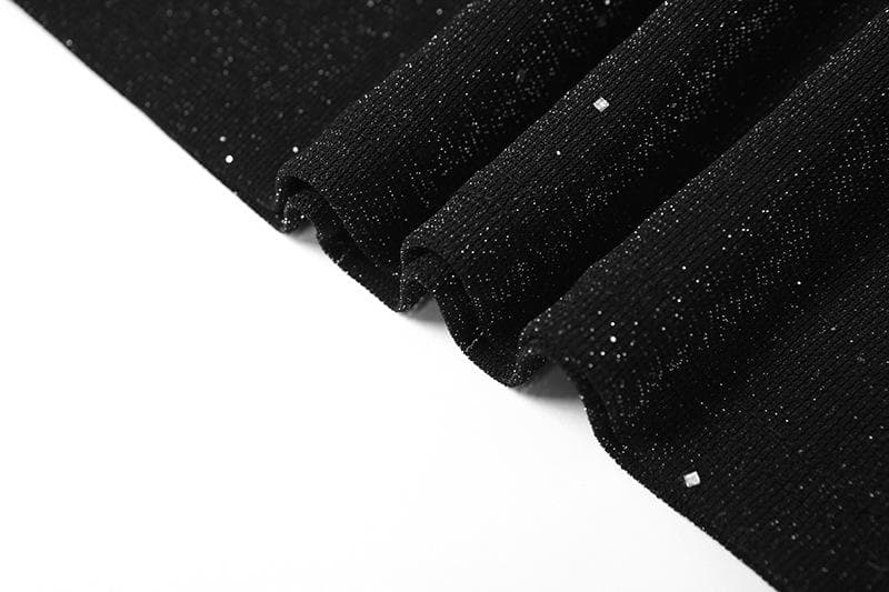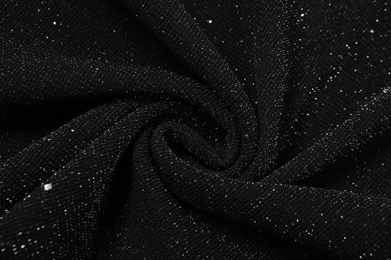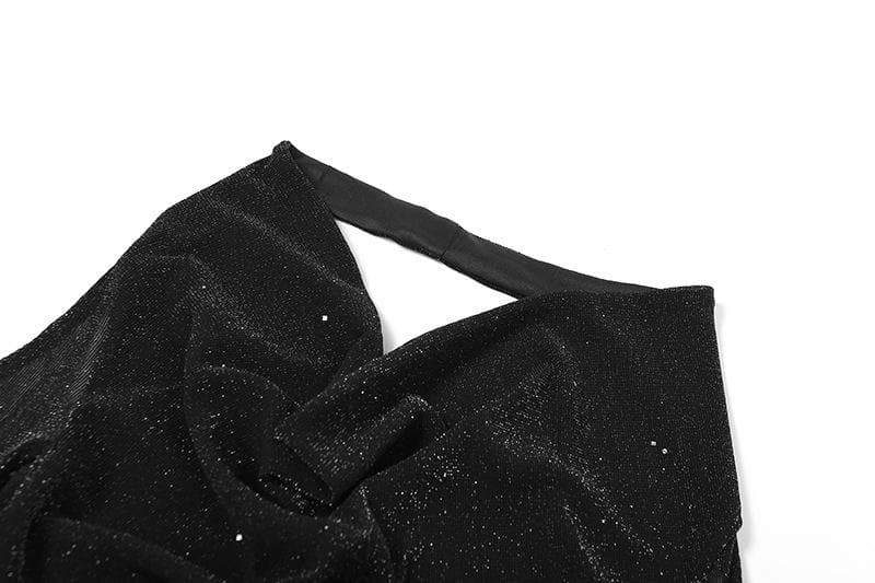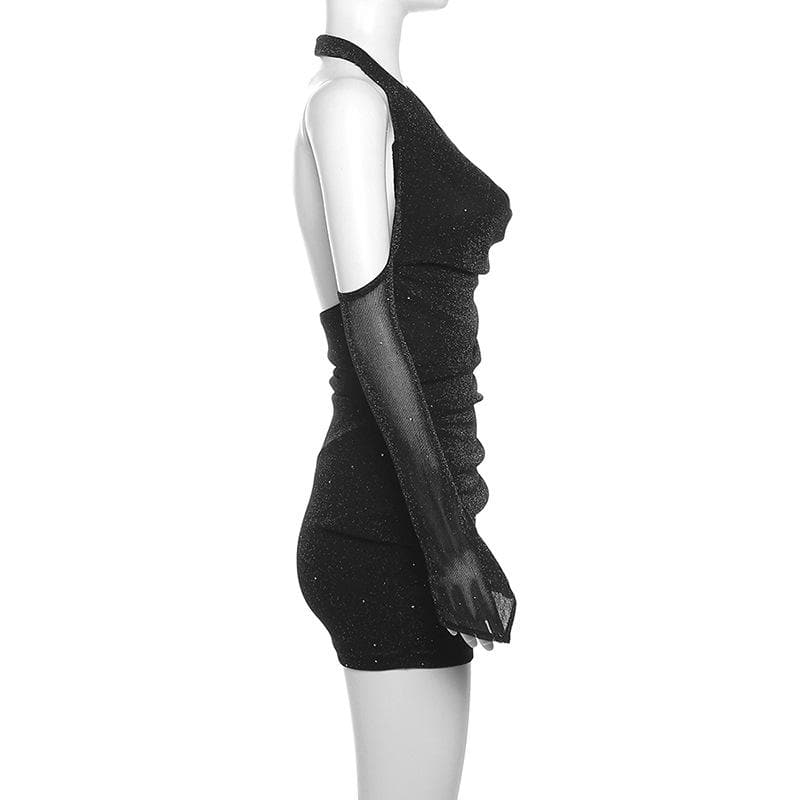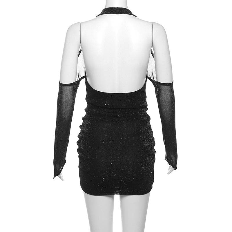 • Long Sleeve Off Shoulder Halter Cowl Neck Glitter Mesh Mini Dress
