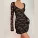 Long Sleeve V Neck Lace Contrast Patchwork Mini Dress
