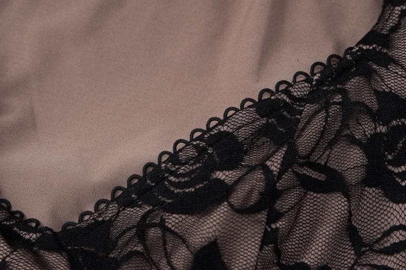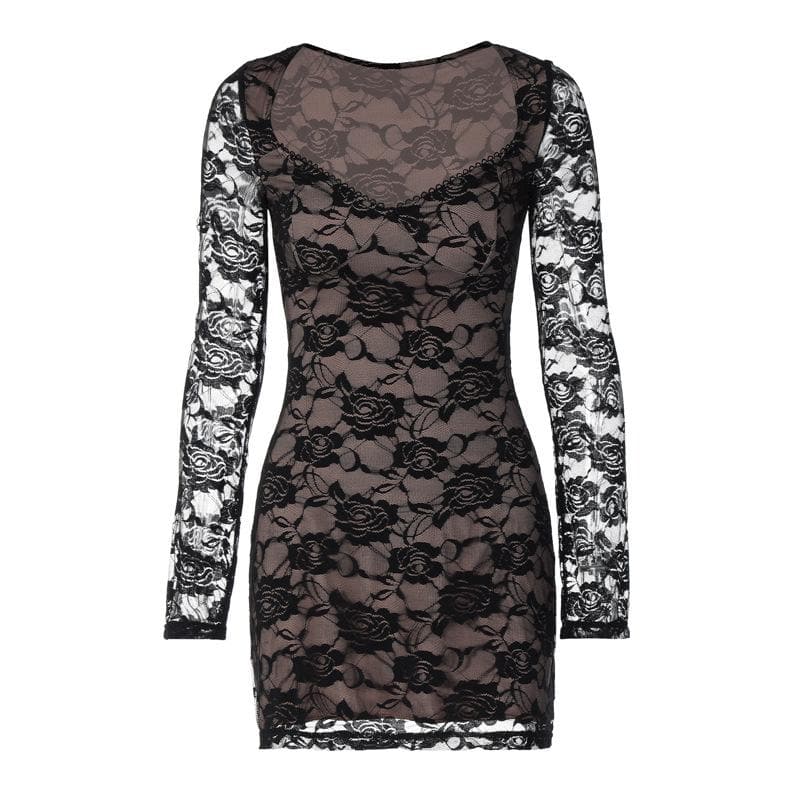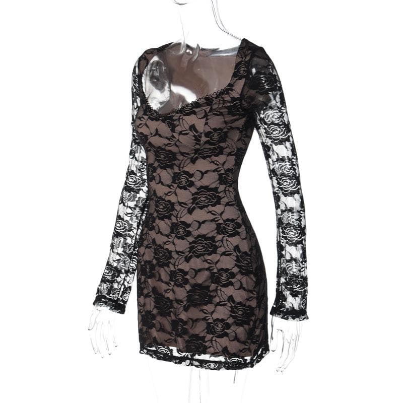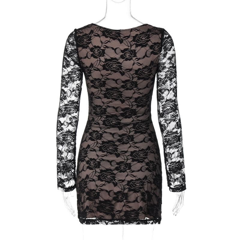 • Long Sleeve V Neck Lace Contrast Patchwork Mini Dress