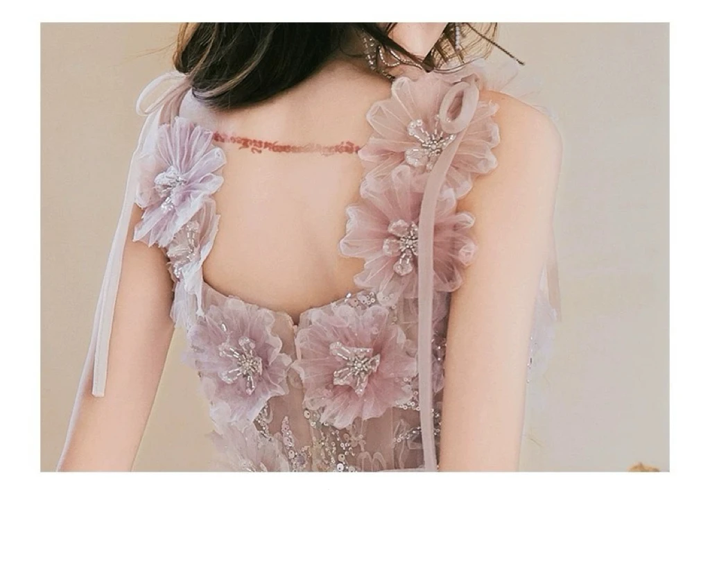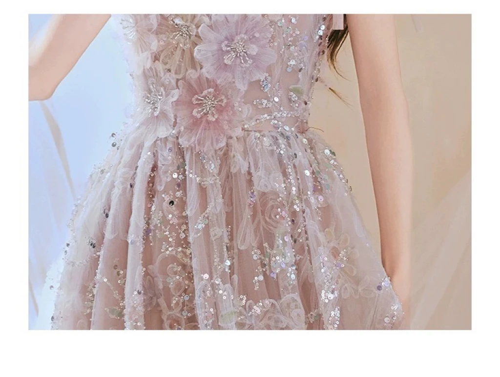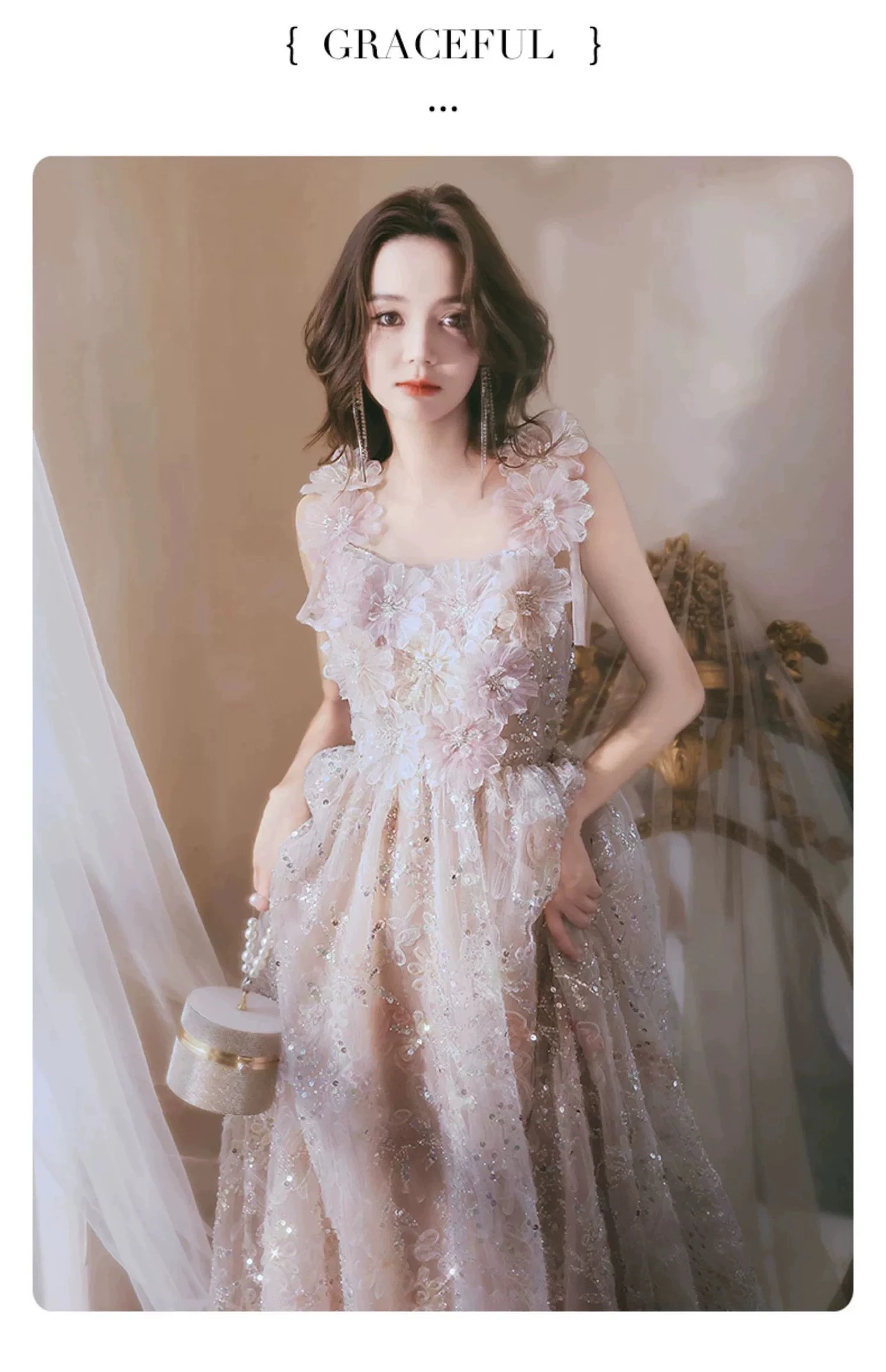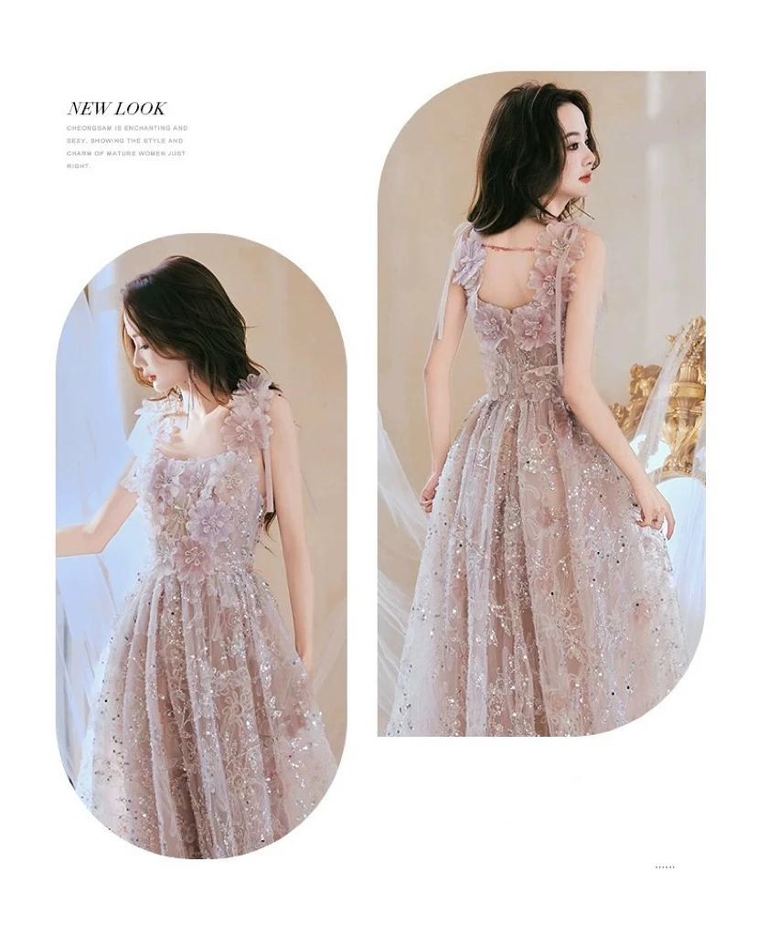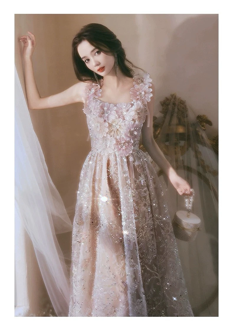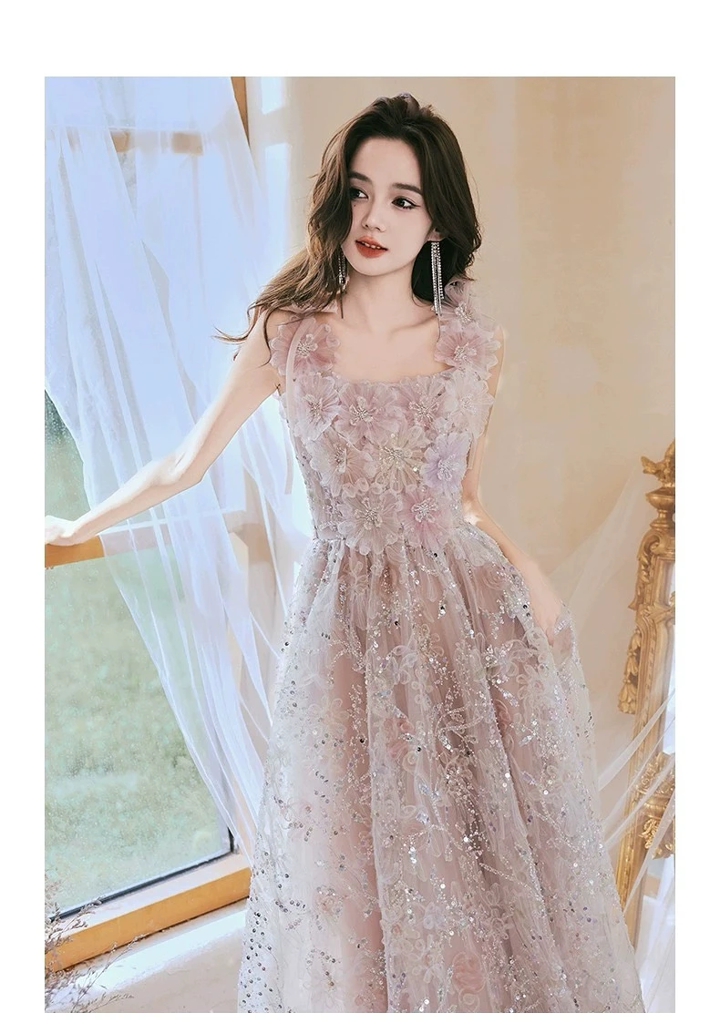Luxury Flower Bridesmaid Dresses Pink Spaghetti Strap Square Collar Beading Bling Bling Fairy Sequins Lace Formal Evening Gowns