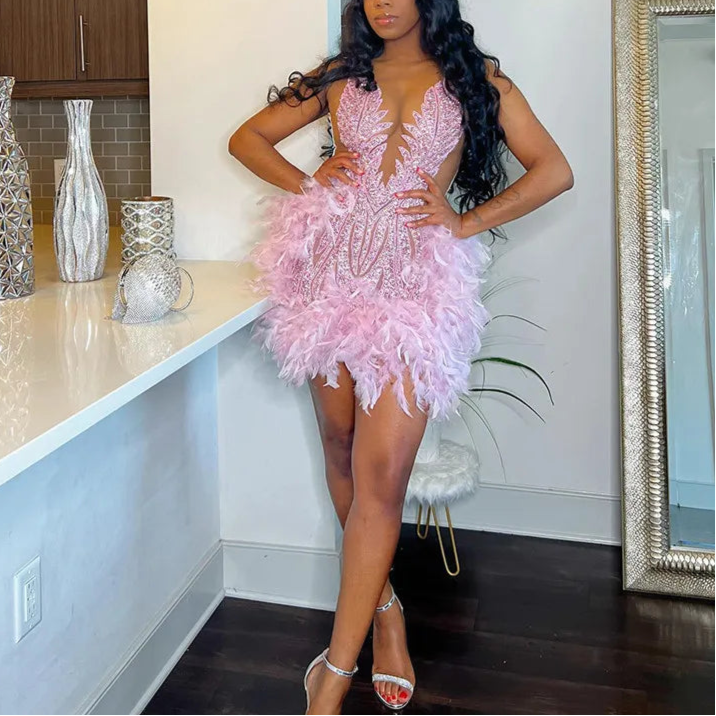 Luxury Pink Feather Short Prom Dresses Black Girls Sexy Sheer Neck Beaded Mermaid Mini Cocktail Gowns for Birthday Party