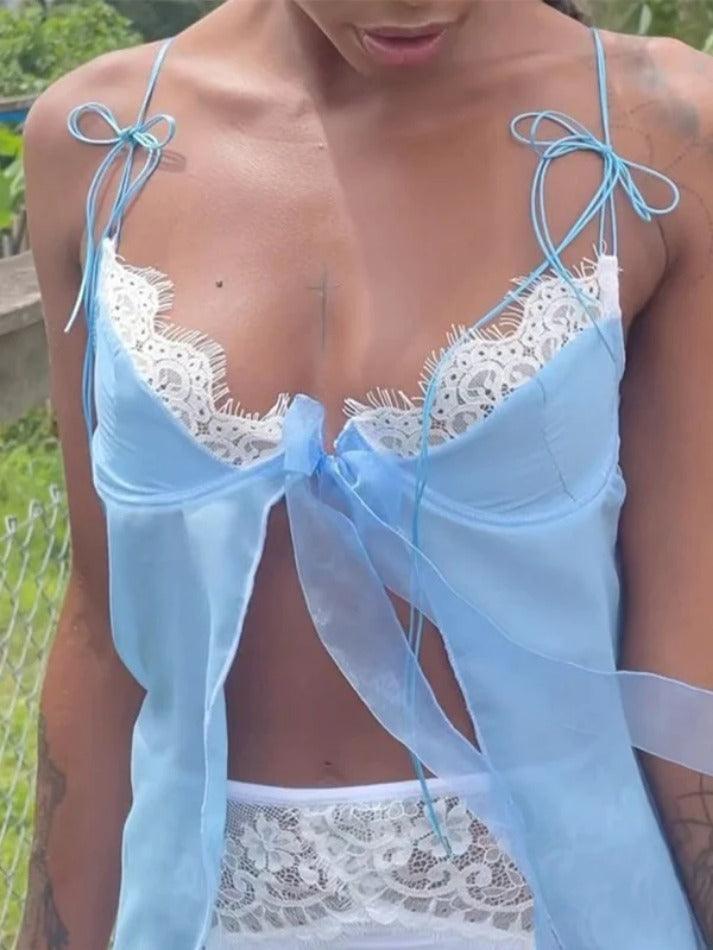Mesh Cutout Lace Patchwork Tie Up Cami Top