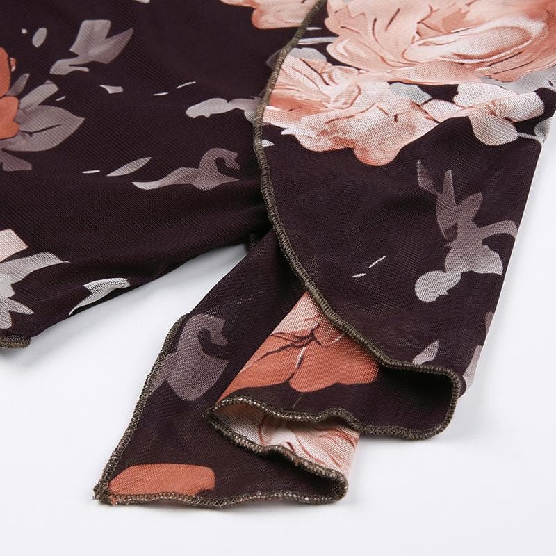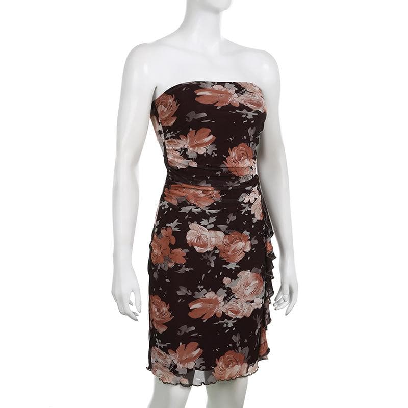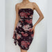 Mesh Flower Print Contrast Ruched Ruffle Backless Tube Mini Dress