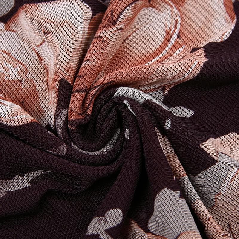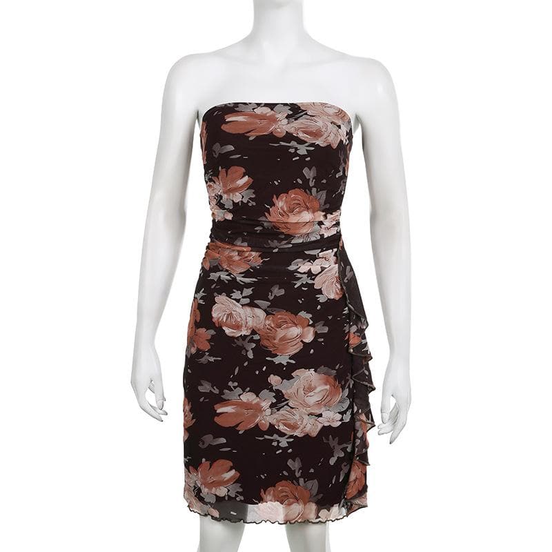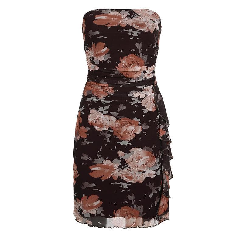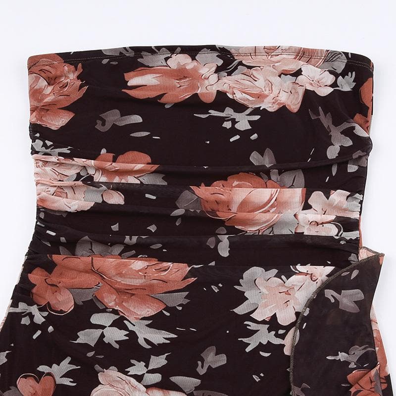 • Mesh Flower Print Contrast Ruched Ruffle Backless Tube Mini Dress