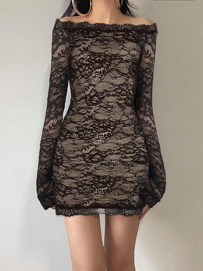 BXOXO - Off-Shoulder Lace Hollow-Out Mesh Mini Dress