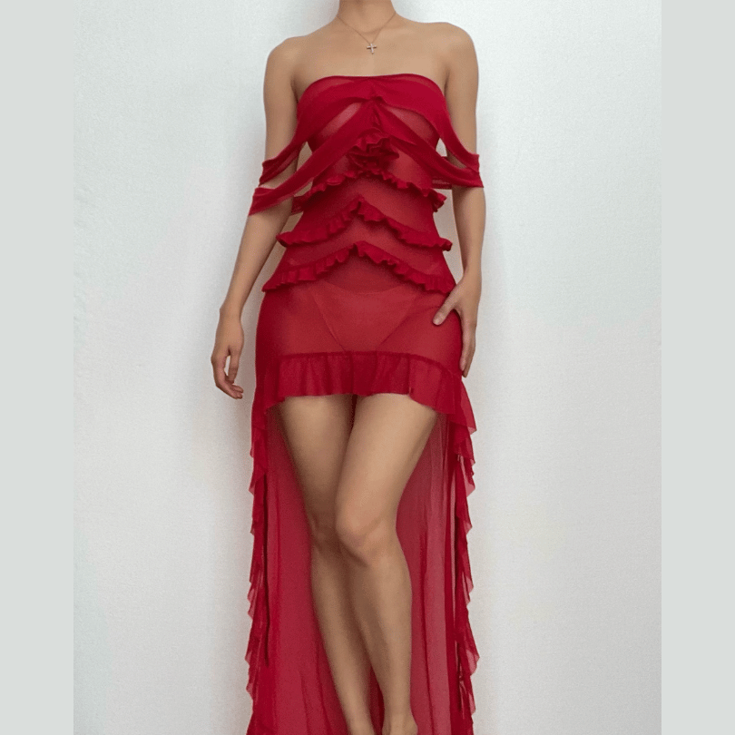 • Off Shoulder Ruffle Sheer Mesh Flower Applique See Through Maxi Dress