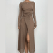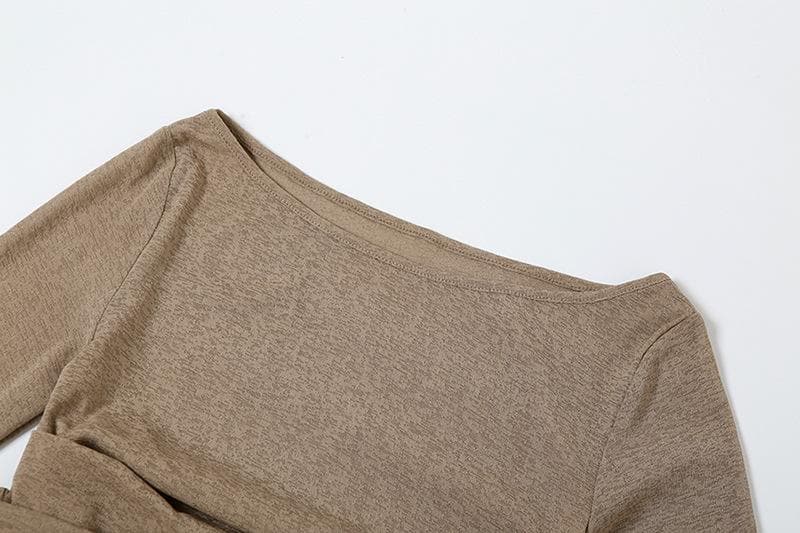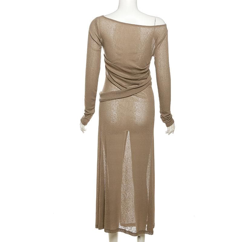 • Off Shoulder See Through Long Sleeve Irregular Slit Midi Dress