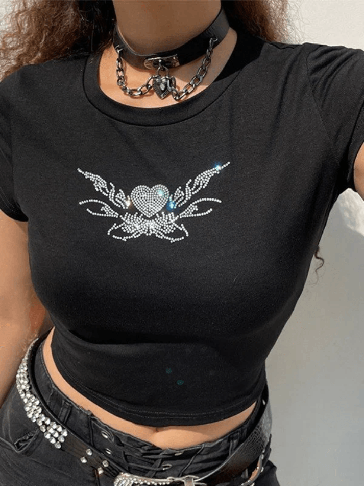 Description: Elevate your style with our Shimmering Heart Wing Crop Top. Embracing the enchanting fairy grunge trend, this top features a figure-hugging silhouette, a trendy crop length, and captivating heart rhinestone decorations. Perfect for the free-spirited Gen Z fashionista.