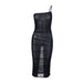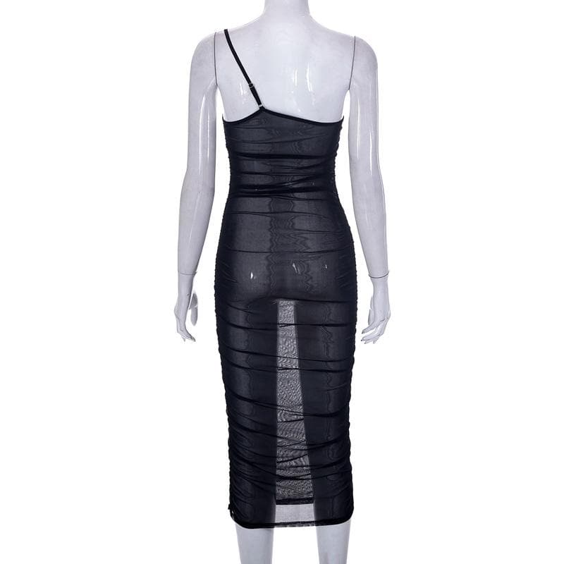 Sheer Mesh See Through One Shoulder Ruched Irregular Midi Dress