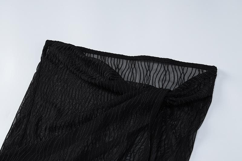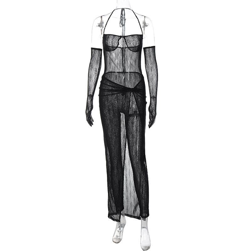 • Sheer Mesh Solid Halter Self Tie Gloves Backless Jumpsuit Skirt Set