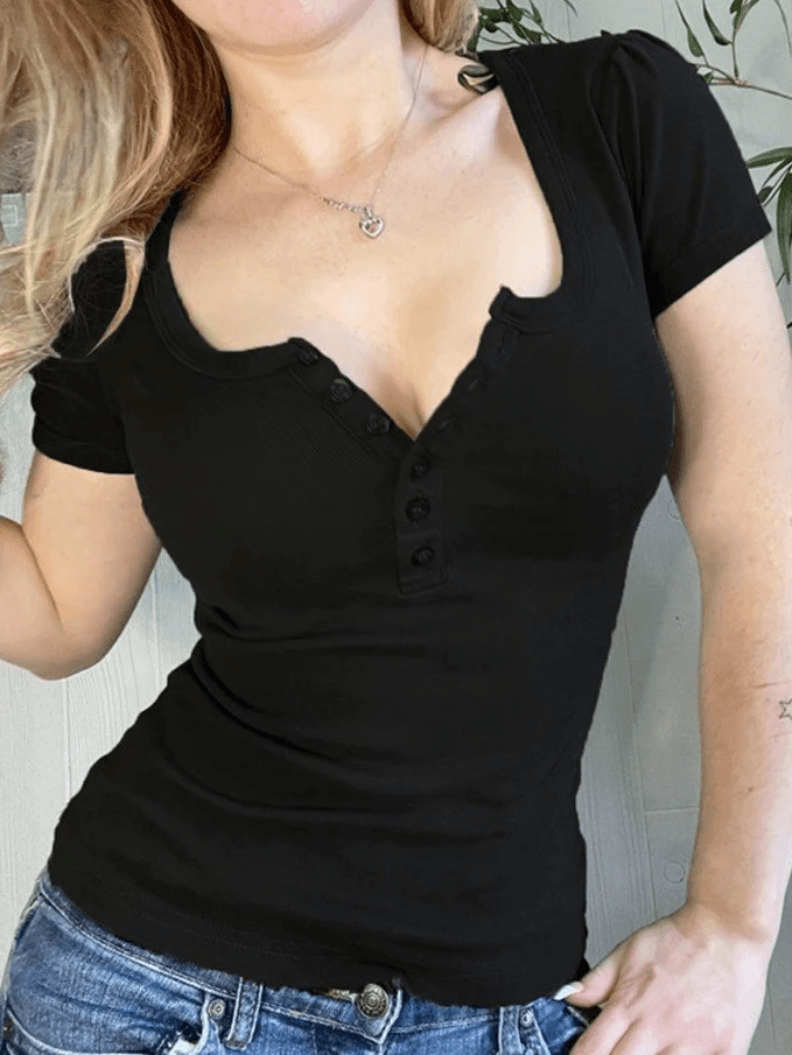 Description: Elevate your everyday style with this chic short sleeve top. Made from stretch ribbed fabric, it offers a comfortable and flattering slim fit. The structured shoulders add a touch of sophistication, while the button front fastening completes the look. A versatile piece that can be dressed up or down, perfect for any occasion.