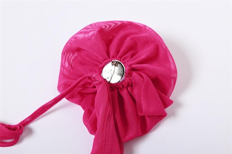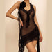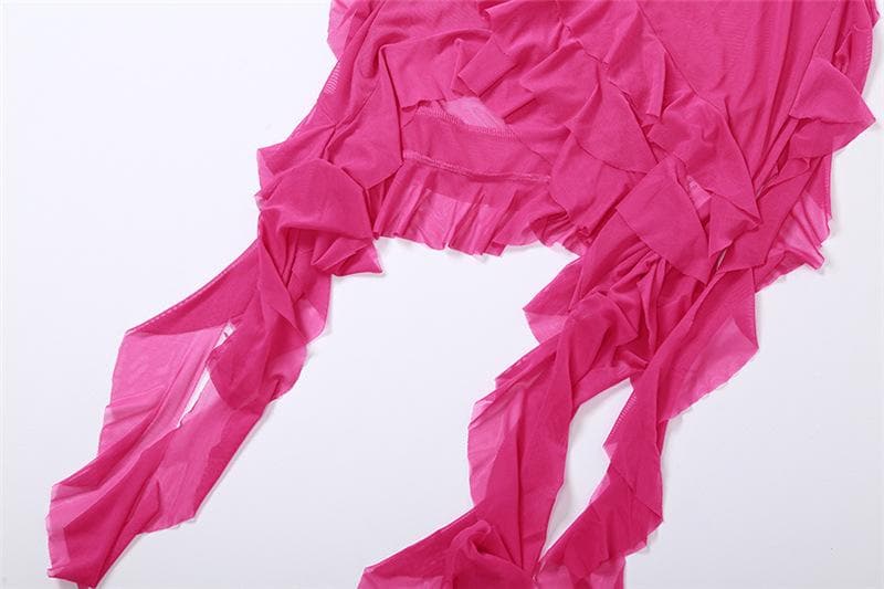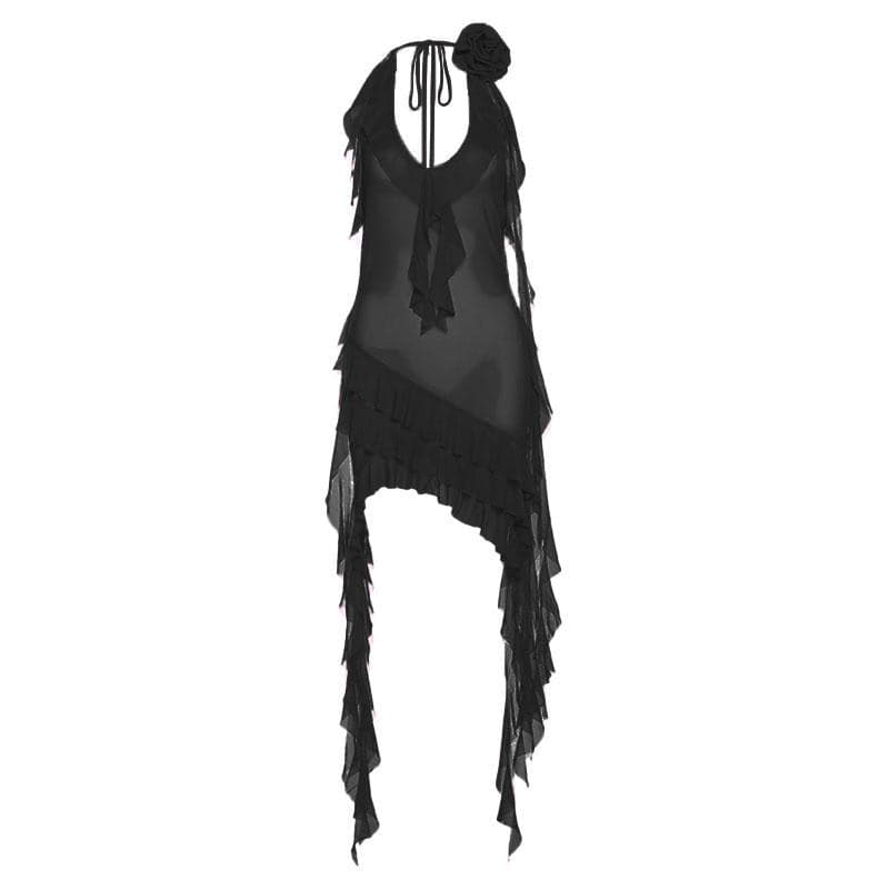 • See Through Halter Sheer Mesh Ruffle Flower Applique Mini Dress