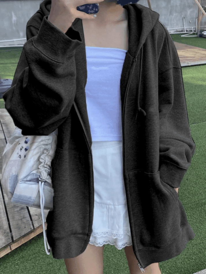 Description: Embrace ultimate comfort with this cozy zip-up hoodie. Crafted with a warm fleece lining, it boasts a flattering silhouette, dropped shoulders, and convenient side pockets. Perfect for fall weather.