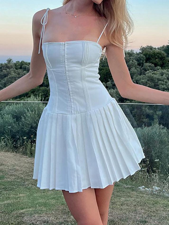 BXOXO - Spaghetti Strap Plain Pintuck Mini A-Line Dress