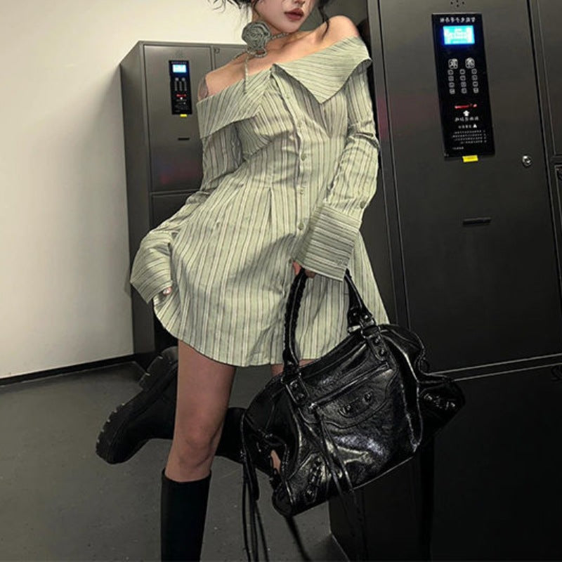 2024 Spring and Autumn French Style Pure Desire Wind One Shoulder Collar Waist Dress Striped Off Shoulder Shirt Short Dresses