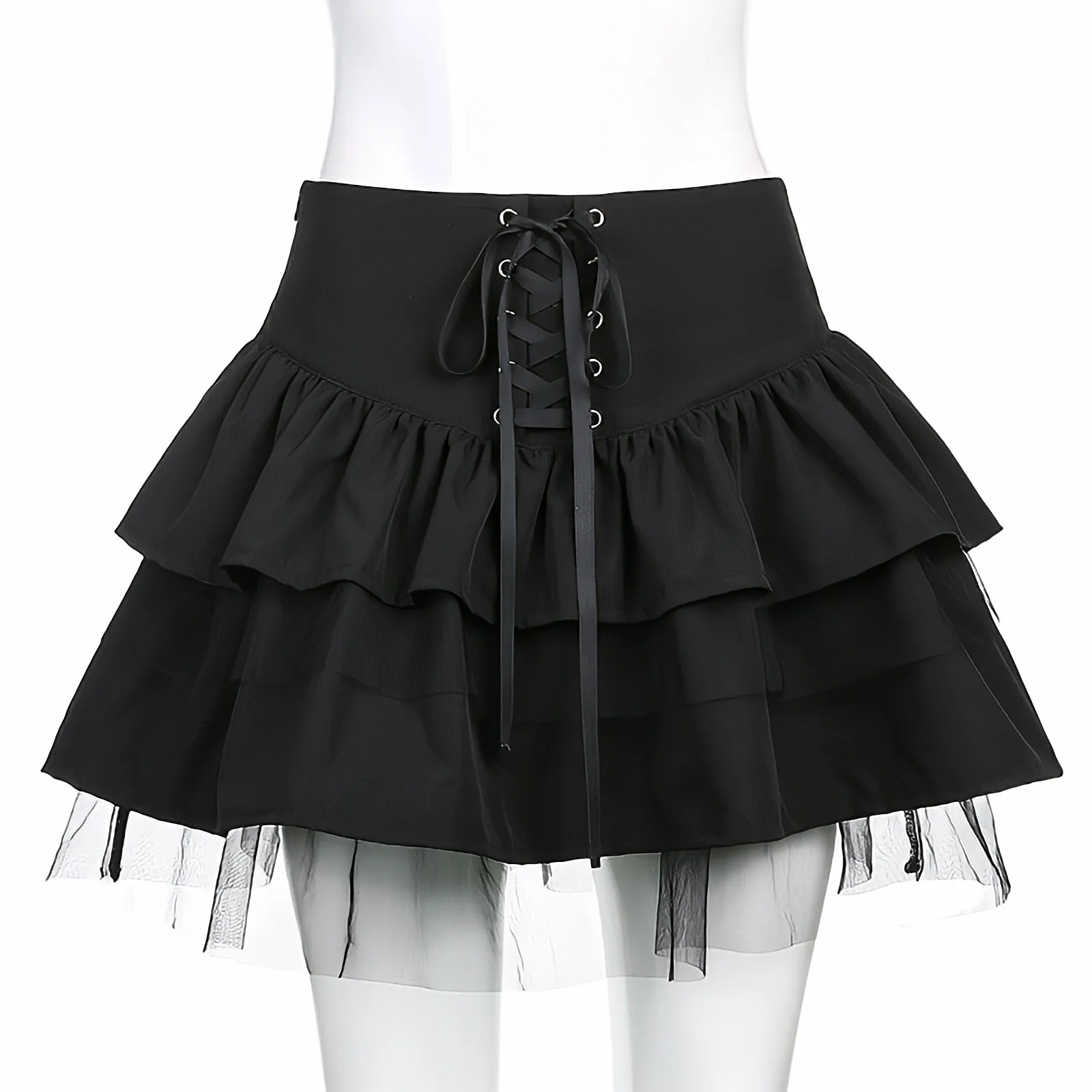 Summer Gothic Lace Cute High Waist Bandage Sexy Mini Skirt Lolita Ruffles Pleated Japanese Black A-Line Y2k Short Tutu Skirt 90s