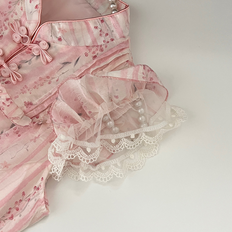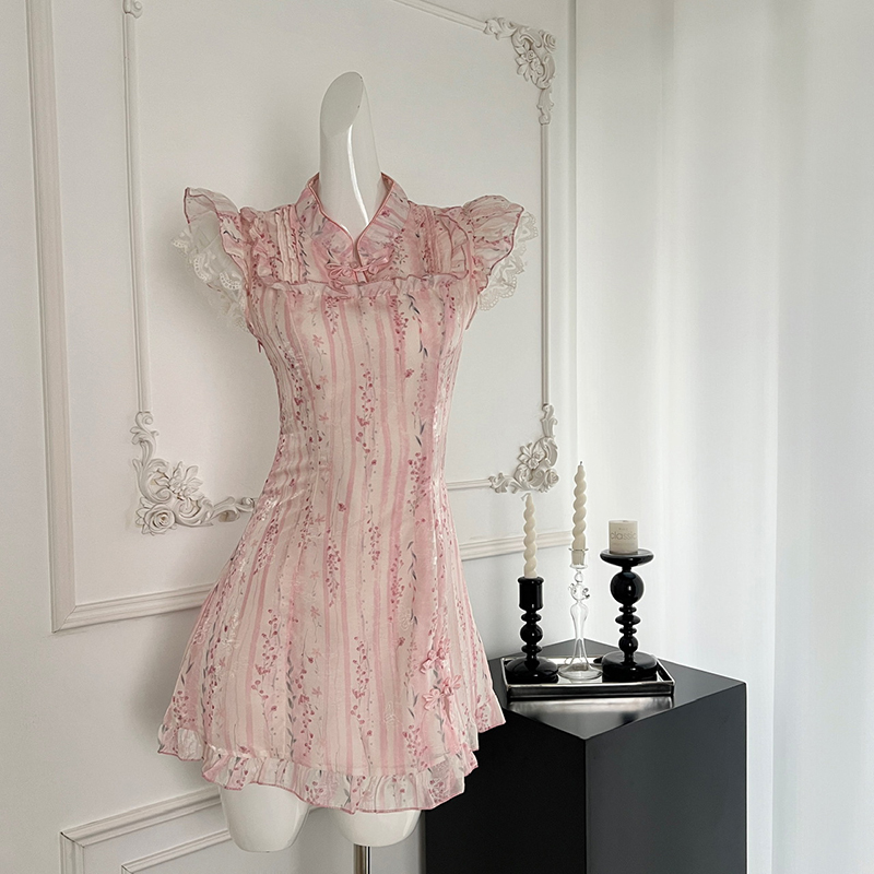 BXOXO - summer inspo Summer New Chinese Style Slim Fit Dresses Fashionable Improved Qipao Sweet Pink Flower Print Dress