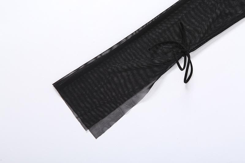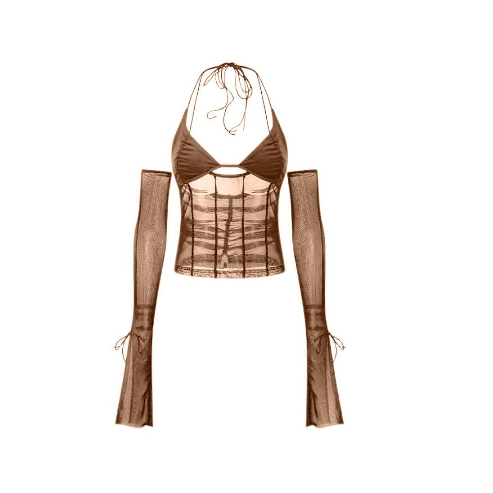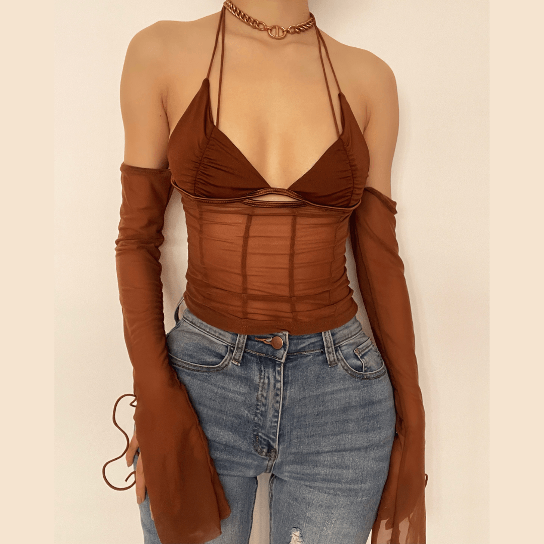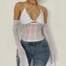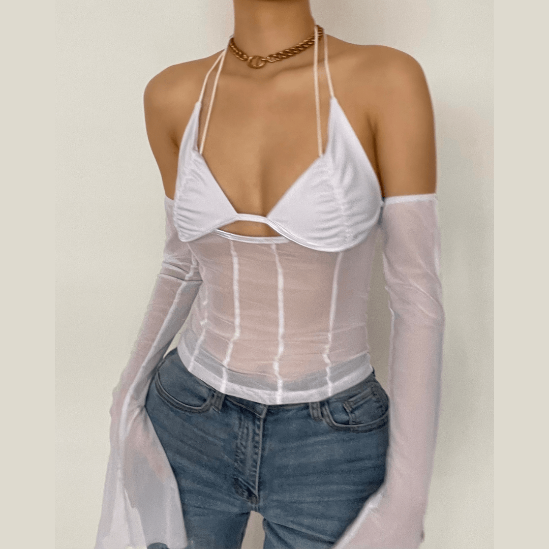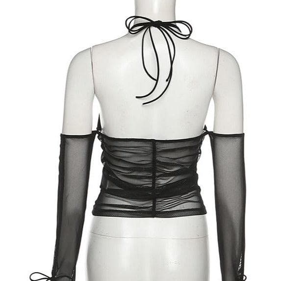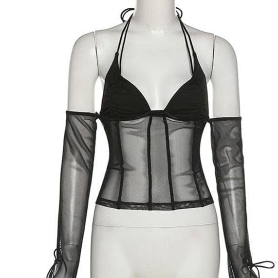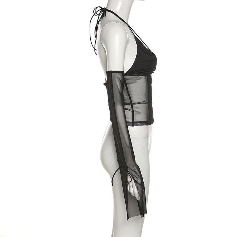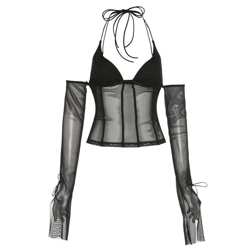 • Tie Back Mesh See-through off Shoulder Halter Top