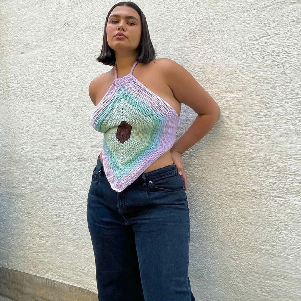This bright-colored knit crop is perfect for strolling down a sandy beach or enjoying a new outing! Crafted with stretchy jersey and spandex. embellished with a pointelle handkerchief profile in color panel. featuring a halter neck along with a tie on the neck. a backless styling tailored with a rear tie. and ended up with an asymmetric hem. Find more unique women's knit tops or trendy clothing in our boutique. and complete it with anything-depending on the look you want.